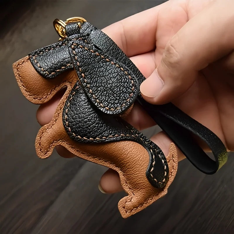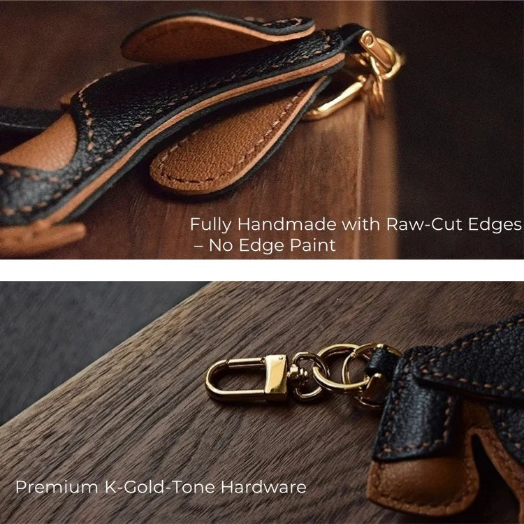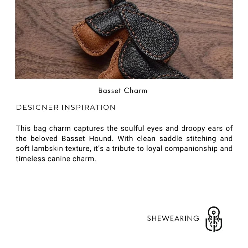 Handcrafted from full-grain lambskin, this Basset Hound Leather Bag Charm brings the gentle spirit of this iconic long-eared breed to life. The expressive eyes, signature droopy ears, and downturned mouth are carefully shaped and saddle-stitched to reflect both personality and elegance. With a refined palette of tan, brown, and ivory, this design evokes warmth and loyalty, making it ideal as a heartfelt gift for pet lovers or as a unique accessory for your bag. Compact yet eye-catching, this piece adds both character and craftsmanship to everyday carry.