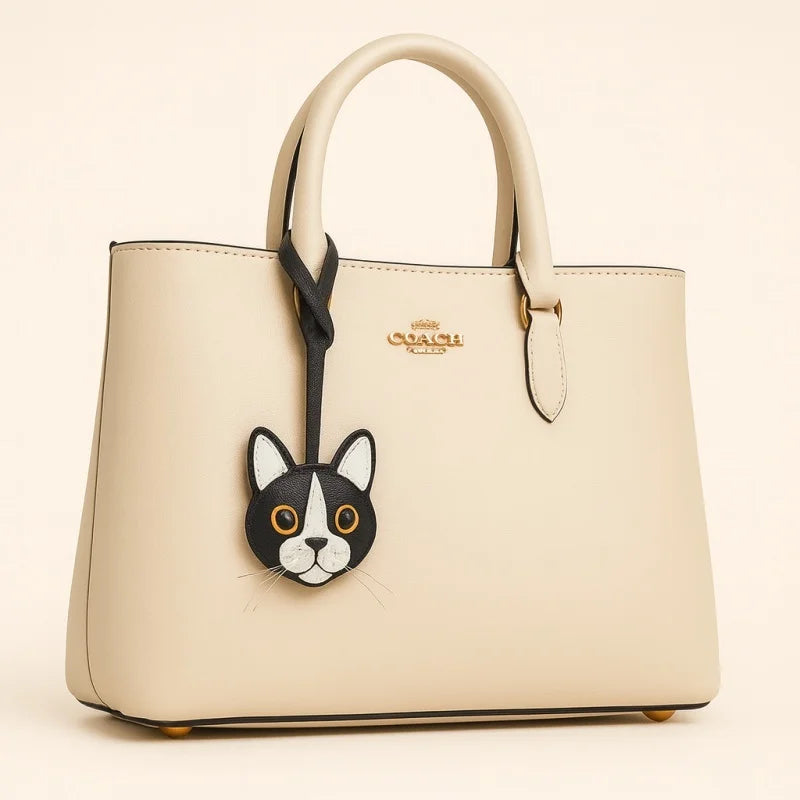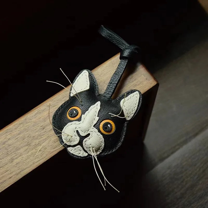 Black and White Cat Leather Bag Charm – Handmade Lambskin Pendant | Cute Cat Face Keychain | Whisker-Inspired Accessory & Gift for Women