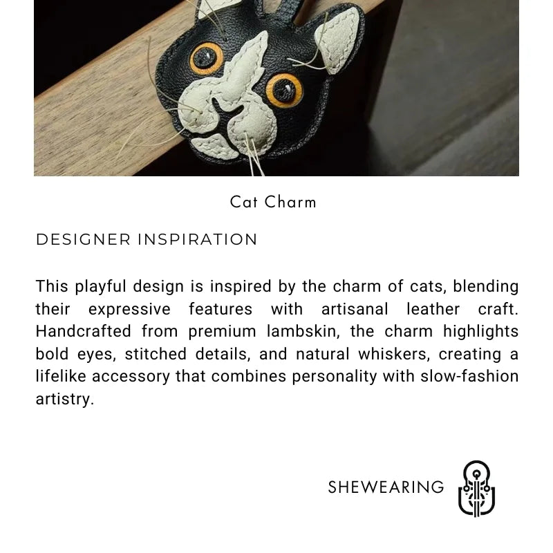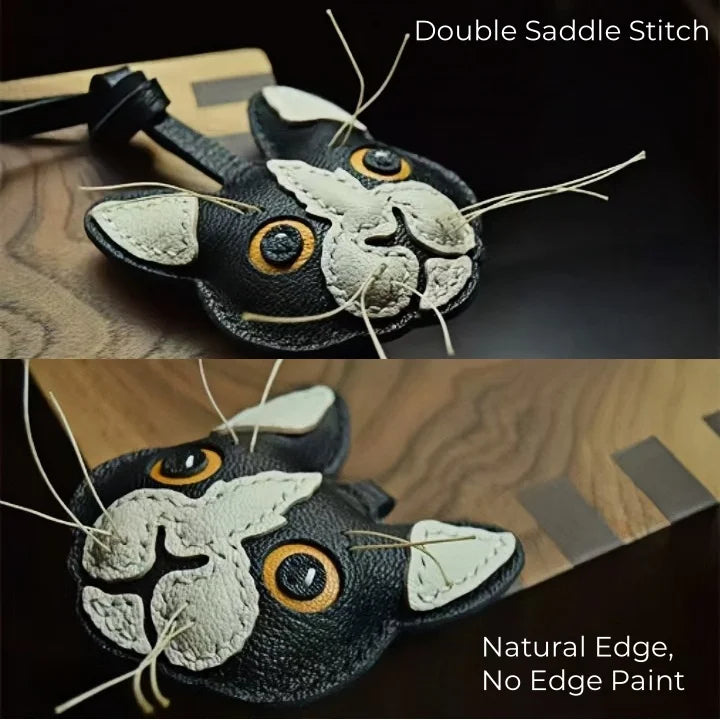 Celebrate your love for cats with the Black and White Cat Leather Bag Charm, a unique handmade accessory crafted from imported French lambskin. This piece captures the lively character of a cat with detailed stitching, textured leather, and natural whisker accents, bringing the face to life with striking realism. Measuring approximately 8 cm by 8 cm, it is compact yet eye-catching, making it an ideal decoration for handbags, backpacks, or use as a keychain. Each charm is stitched with the double saddle technique for durability and left with natural leather edges for an authentic touch. The wide-eyed design and playful contrast of black and white leather make it a standout piece that appeals to animal lovers and fashion enthusiasts alike. Perfect as a thoughtful gift or as a collectible accessory, this cat charm embodies the artistry of slow fashion, turning everyday essentials into conversation-starting treasures.