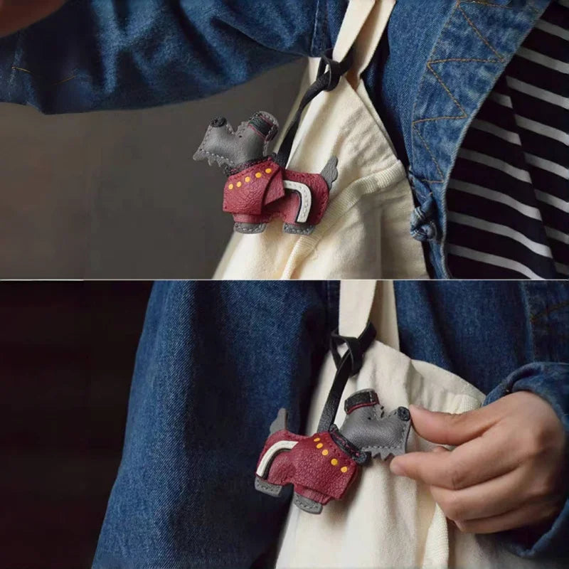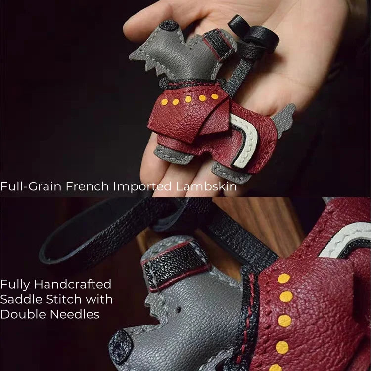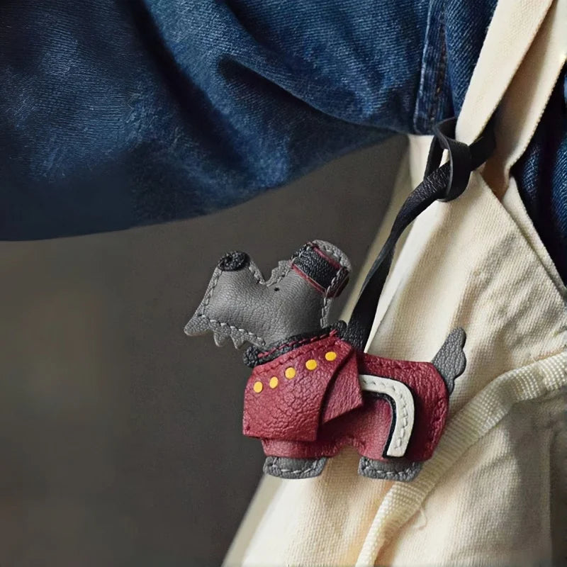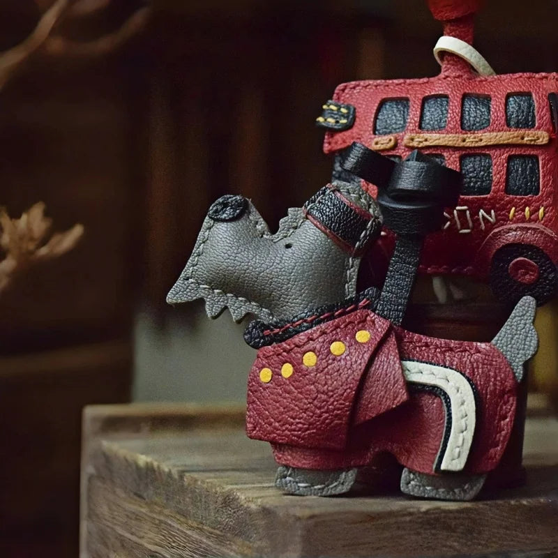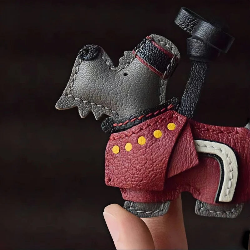 This handcrafted leather bag charm is shaped like a dapper British terrier, exuding vintage charm and elegance. Made with full-grain French imported lambskin, the piece features detailed saddle stitching and hand-cut panels, echoing the style of traditional London guards. The adorable silhouette, rich texture, and deep red-and-gray color palette make it a standout accessory on any handbag or key set. Measuring approximately 9.5cm × 8cm, it's a pocket-sized luxury full of character and craftsmanship. Ideal as a gift for dog lovers or anyone who appreciates artisanal design with a playful twist.