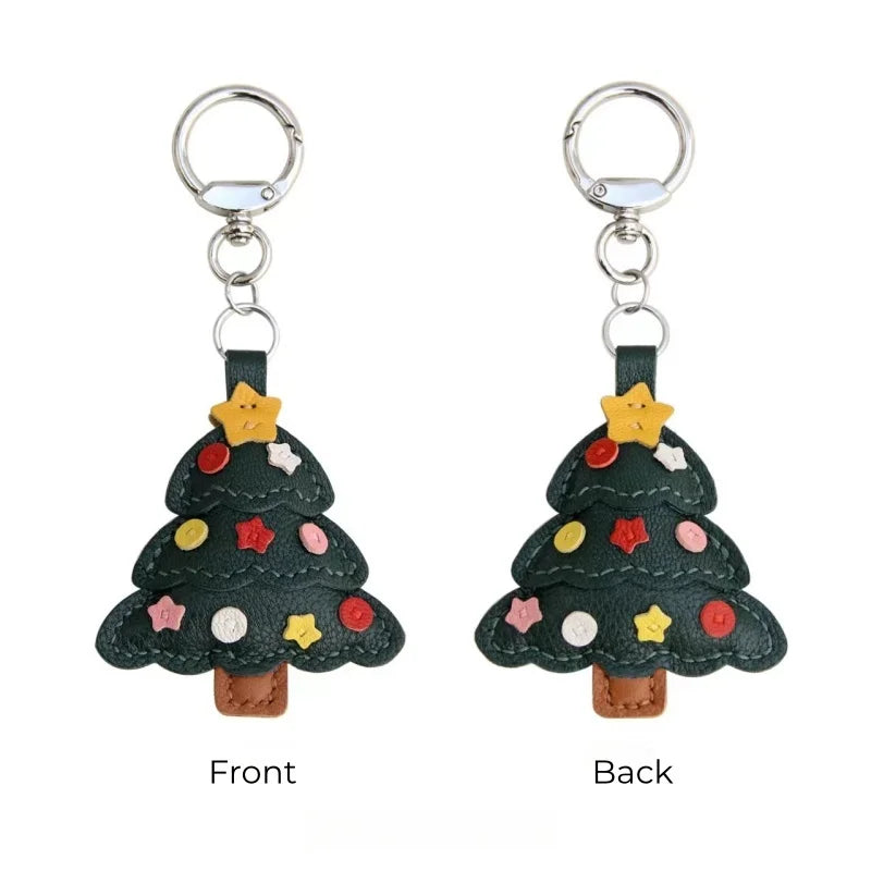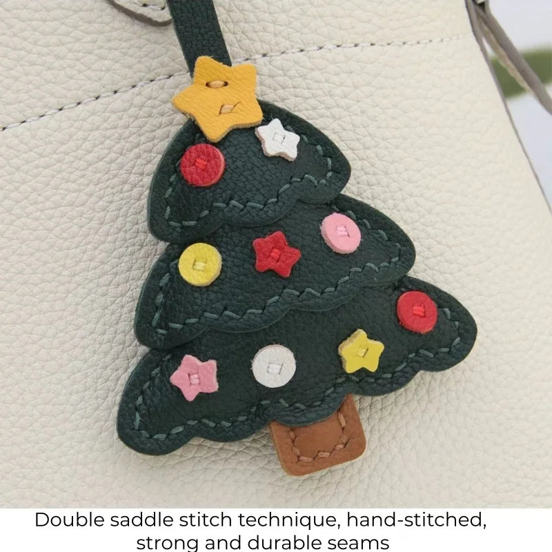 Bring the festive spirit to your style with this handcrafted Christmas Tree Leather Bag Charm, made from luxurious top-grain sheepskin. Designed with meticulous detail, the charm features vibrant leather ornaments, a golden star, and layered stitching that captures the joy of the season. Each piece is carefully hand-cut and double saddle-stitched, ensuring durability while highlighting the artistry of traditional leathercraft.