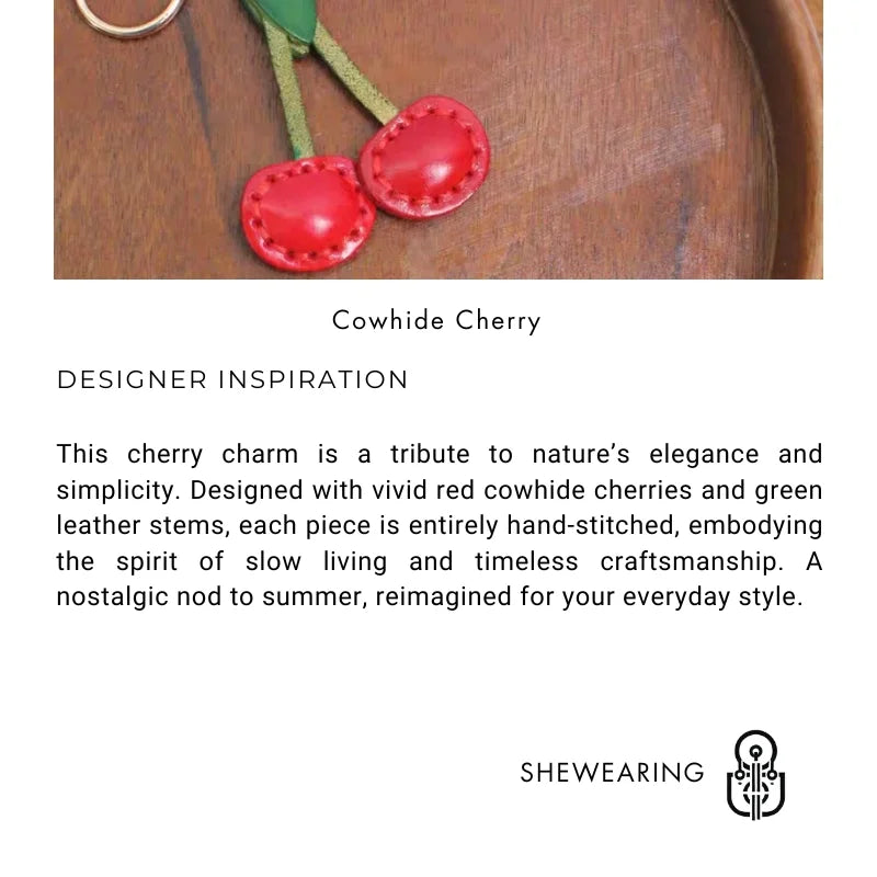 Bring a cheerful burst of character to your favorite accessories with this Classic Cherry Leather Bag Charm. Featuring two plump cherries crafted from full-grain cowhide leather, this charm is designed to celebrate craftsmanship and simplicity. Each cherry is hand-cut and hand-stitched, resulting in a uniquely textured finish that feels both nostalgic and fresh.