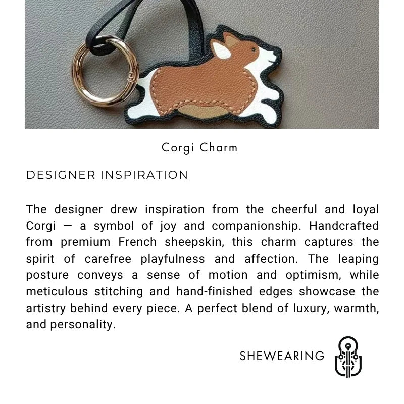 The Corgi Leather Bag Charm celebrates the bond between elegance and joy. Handcrafted from soft French sheepskin, it features smooth leather texture, lively contours, and a polished gold-tone ring for effortless attachment. Each charm is carefully stitched and edge-finished by artisans to ensure both beauty and durability.