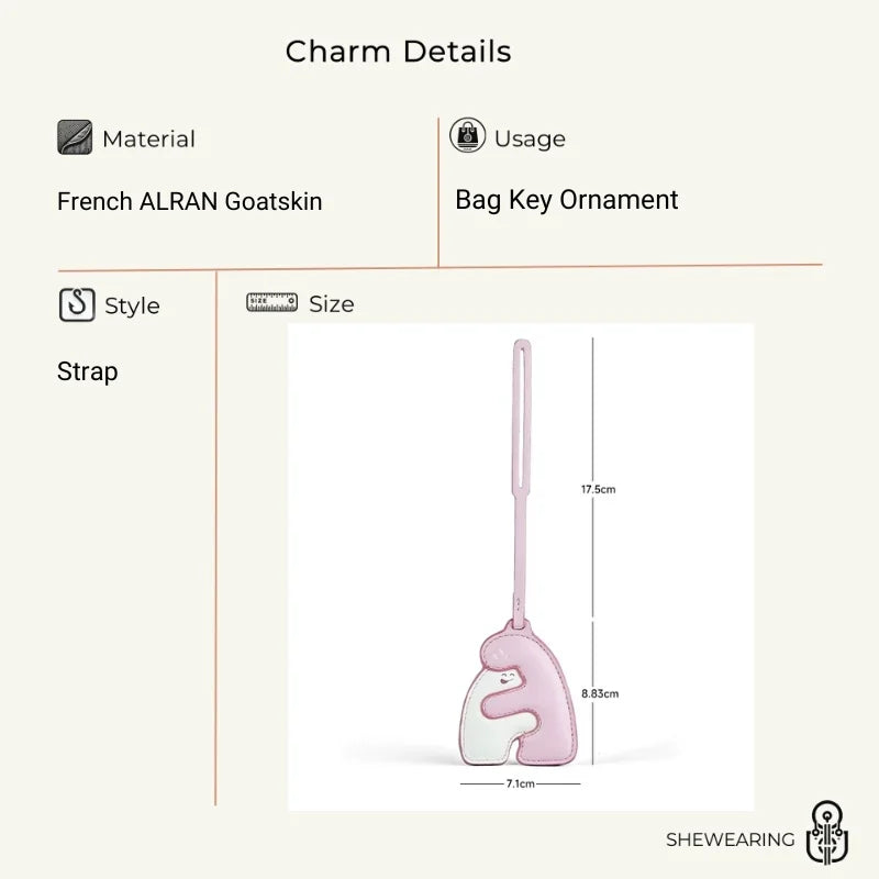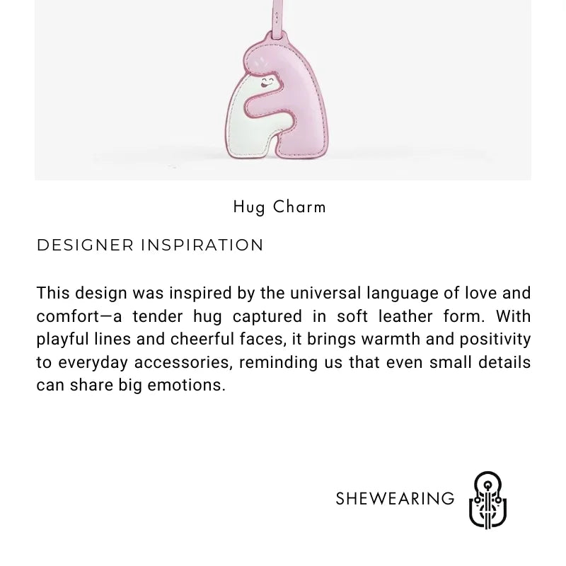 Measuring approximately 8.8 cm in height with a 17.5 cm strap, the Hugging Charm is lightweight and versatile. It can be used as a handbag ornament, a keychain, or a thoughtful gift for someone special. Available in pink and metallic tones, it pairs beautifully with both casual and refined handbags, adding a touch of personality and emotional warmth.