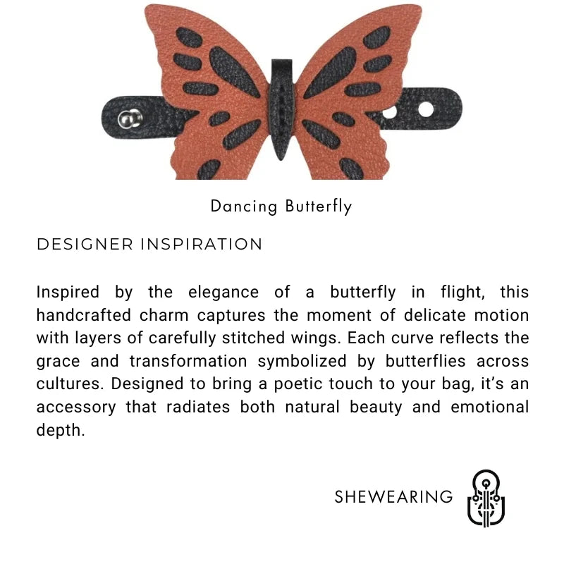 Bring a breath of lightness and elegance to your accessories with the Dancing Butterfly Leather Bag Charm. Handcrafted from high-quality cowhide leather, this charm is shaped like a butterfly mid-flight, with detailed layered wings that create a soft three-dimensional effect.