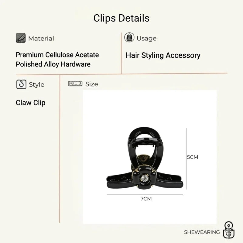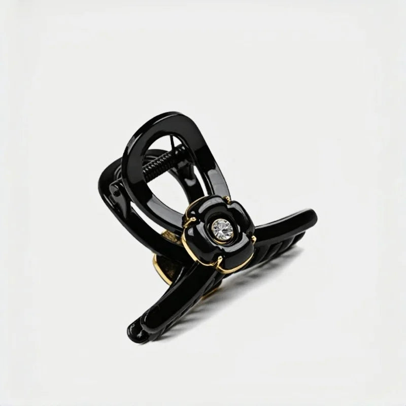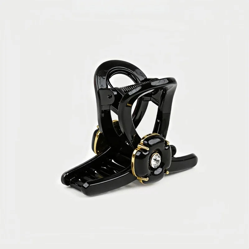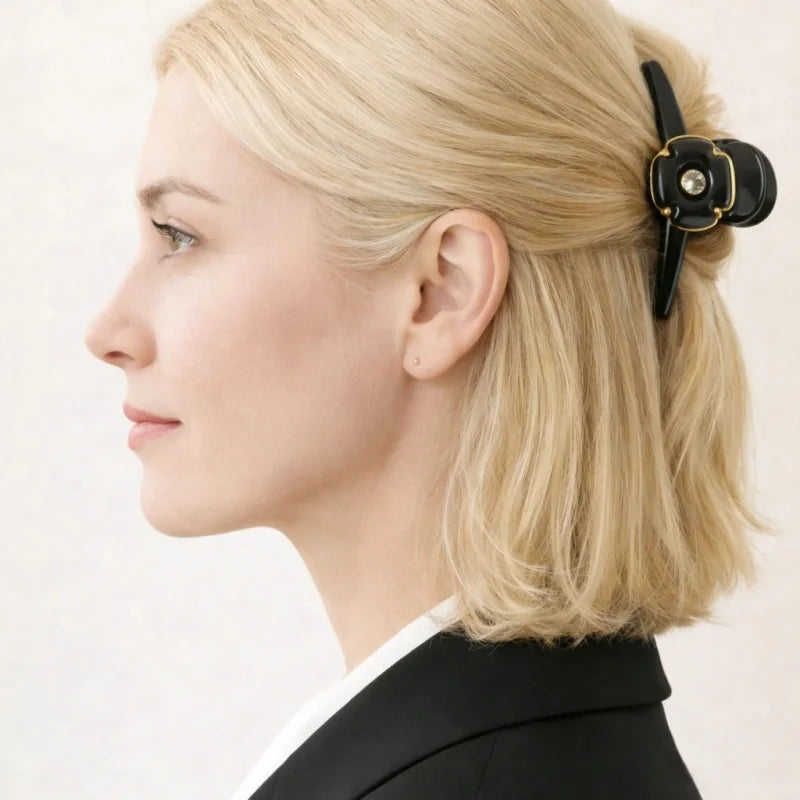 Elegant Black Camellia Crystal Hair Claw Clip – French Vintage Style Acetate Hair Accessory | Strong Hold Large Claw Clip with Gold Detail | Refined Everyday Styling Gift for Her