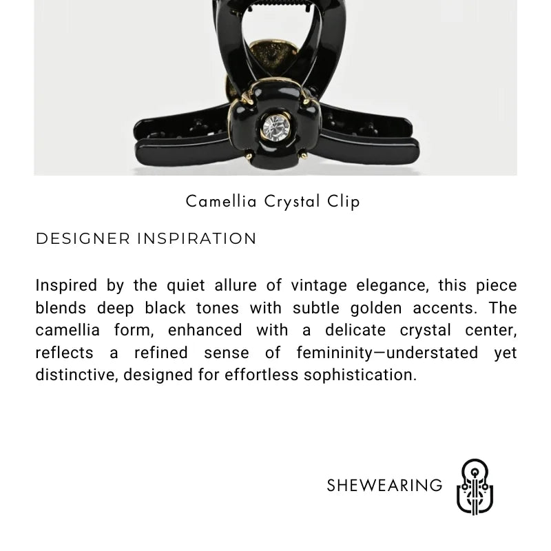 At its center, a sculpted camellia flower is outlined with subtle gold accents and finished with a delicate crystal detail. This combination of black, gold, and light reflection creates a sophisticated visual contrast, adding depth and a quiet sense of luxury to the piece.