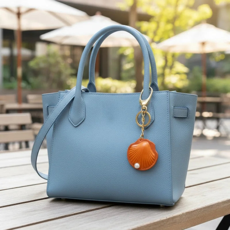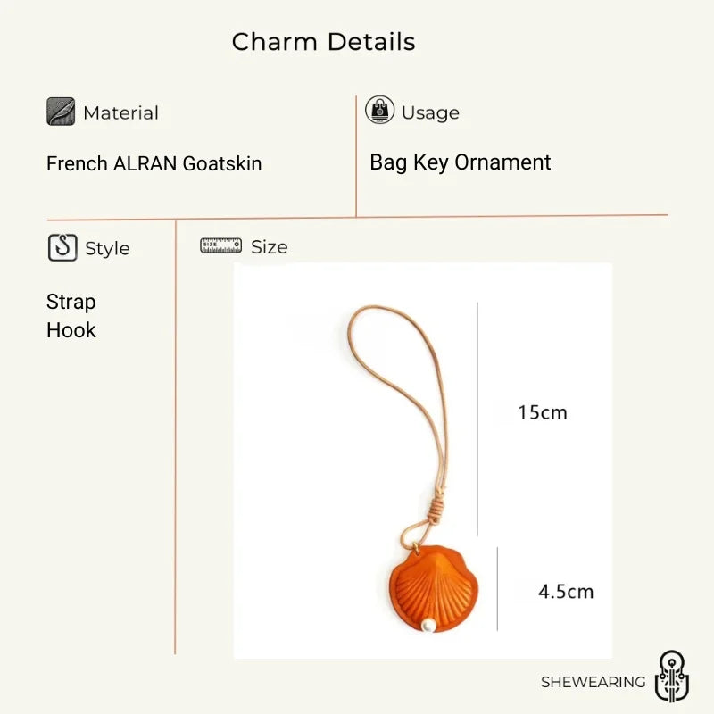 Elegant Scallop Shell Full-Grain Leather Bag Charm | Double-Sided Vintage-Style Purse Accessory with Faux Pearl Accent | Luxurious Collectible Key Fob