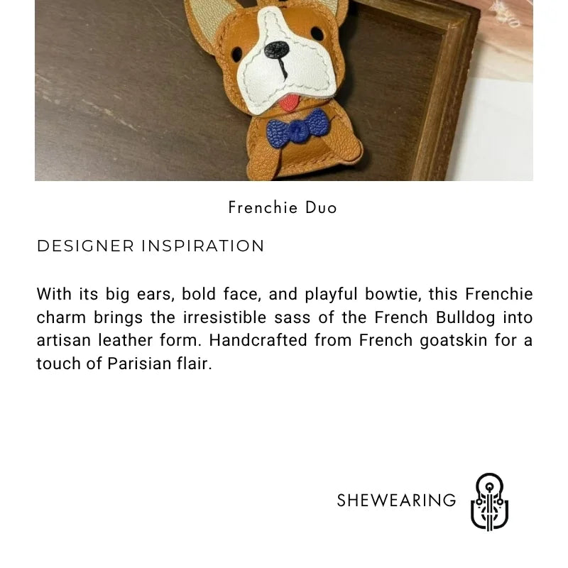 Add a dash of French charm to your accessories with our French Bulldog Leather Bag Charm. Carefully handmade from premium French goatskin, this lovable piece captures the spunky spirit of the iconic Frenchie—complete with expressive eyes, floppy tongue, and a signature bowtie. Offered in two colorways for mix-and-match appeal, it makes a delightful gift for couples, pet lovers, or anyone who enjoys a touch of whimsy. Whether clipped to your tote, backpack, or keys, this hand-stitched charm brings personality and playful style wherever it goes.