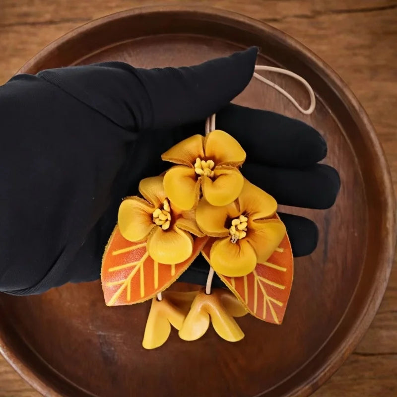 This Golden Osmanthus Leather Bag Charm is a refined piece that highlights the beauty of seasonal florals through artisanal craftsmanship. Handmade from full-grain cowhide, it features a cluster of vibrant golden osmanthus blossoms paired with delicately carved leaves, each petal carefully cut and assembled for a lifelike three-dimensional effect. The warm golden-yellow tones are accented with hand-painted leaf patterns, echoing the charm of autumn foliage. Measuring approximately 11.4 cm in length and 3.1 cm in width, it is the perfect accessory for handbags, totes, or even as a unique keychain. The durable leather strap ensures secure attachment while enhancing the charm’s natural aesthetic. Both decorative and symbolic, this charm conveys wishes of happiness and prosperity, making it an ideal gift for women who appreciate handmade artistry and seasonal elegance.
