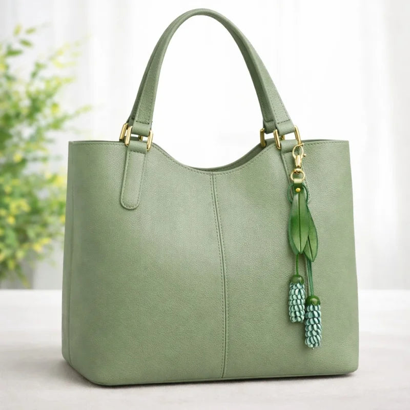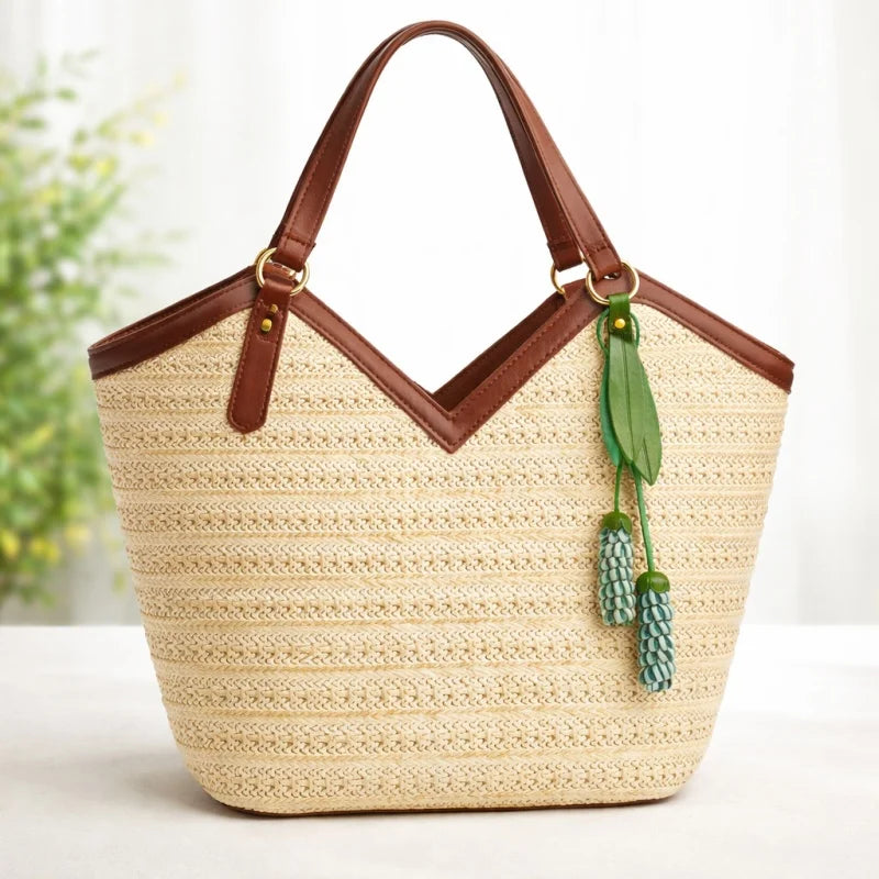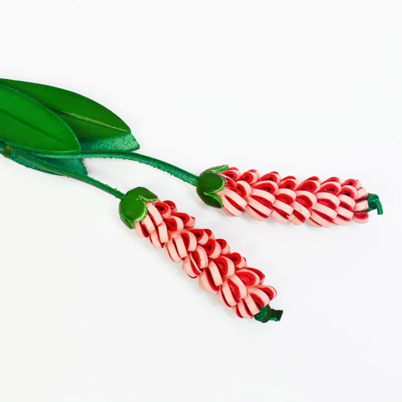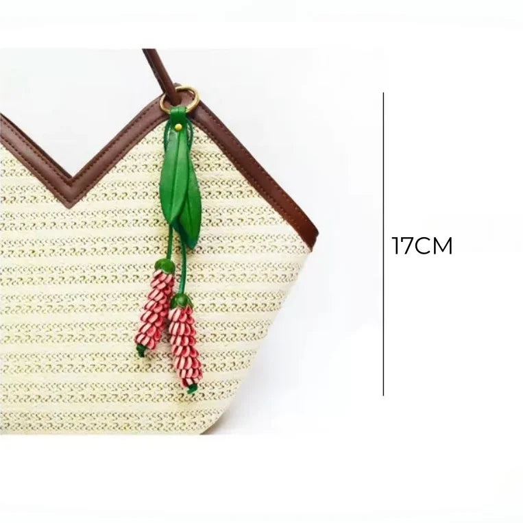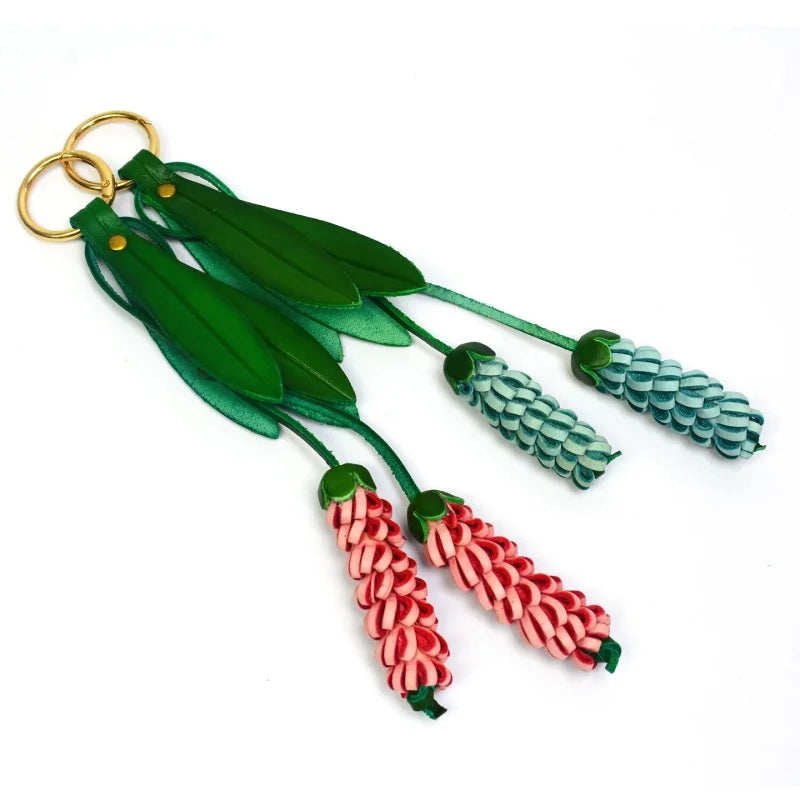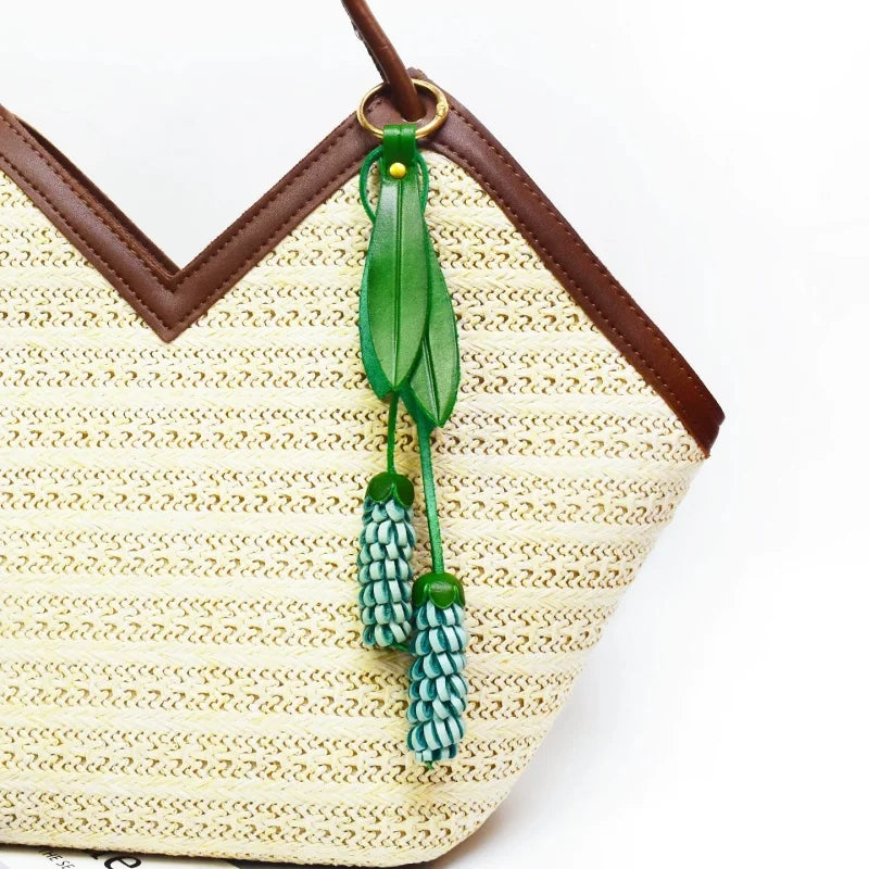 The vibrant yet balanced color pairings—soft coral with cream, or mint with cool teal—bring freshness without overpowering your handbag. Paired with elegant green leather leaves and suspended from a sturdy brass ring or leather loop, the design feels both artisanal and sophisticated.