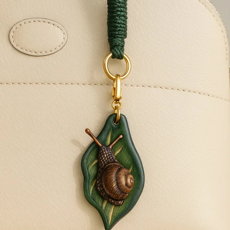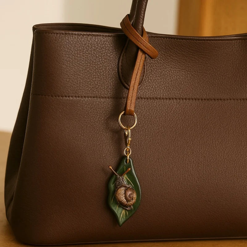 Handcrafted Leather Leaf & Bronze Snail Bag Charm – Unique Nature-Inspired Pendant | Artistic Handmade Accessory for Bags, Keys & Gifts