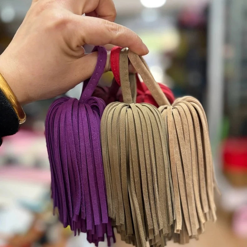Each charm is carefully handmade using genuine suede leather, cut into dozens of fine, flowing strips that create a rich and luxurious tassel effect. The soft texture and layered structure allow the tassel to move naturally as you walk, giving your bag a sense of motion and relaxed sophistication.