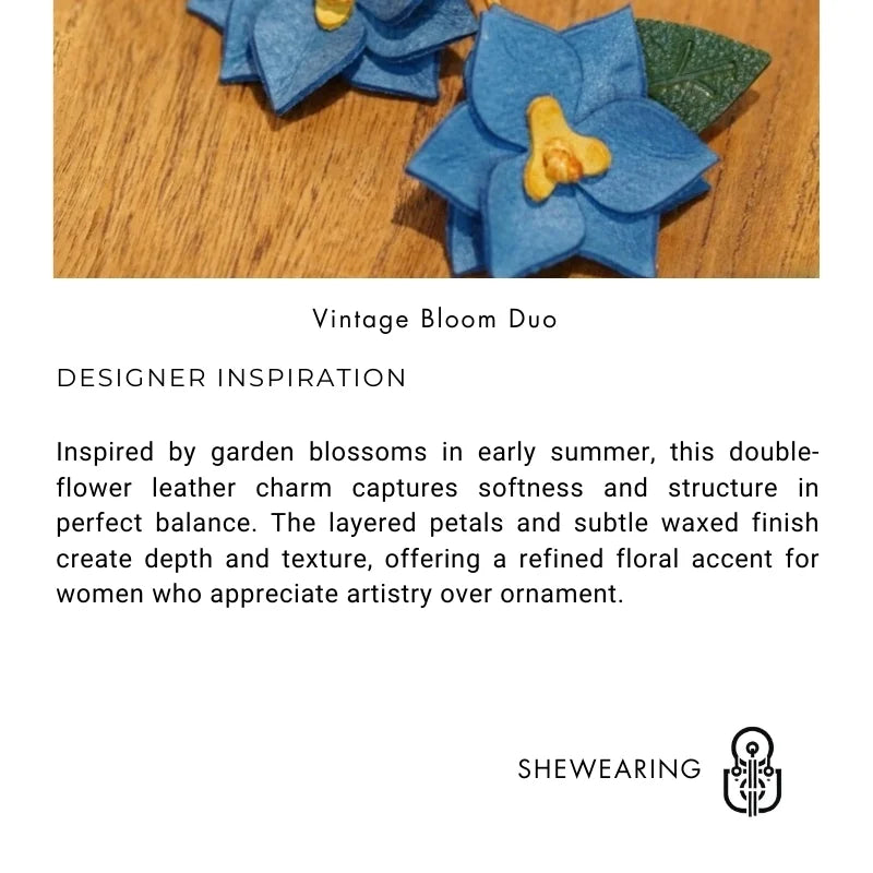 Available in refined colorways—deep sapphire blue, muted lavender, soft sage, and warm butter yellow—each variation is thoughtfully paired with subtle contrasting centers and leafy accents. The dual-flower design adds visual balance, offering more impact than a single charm while remaining understated and elegant.