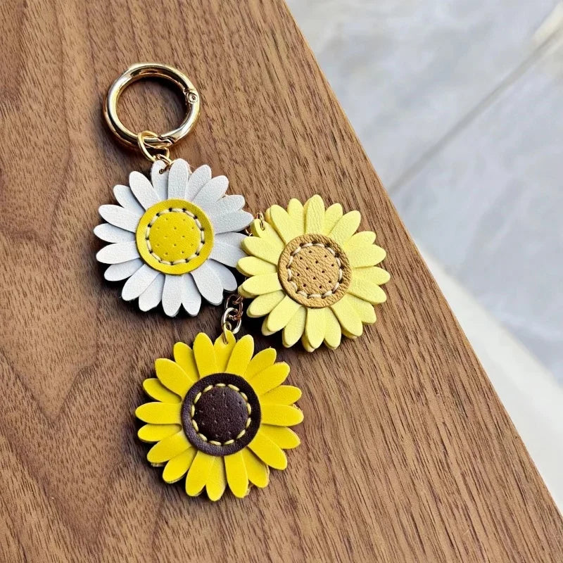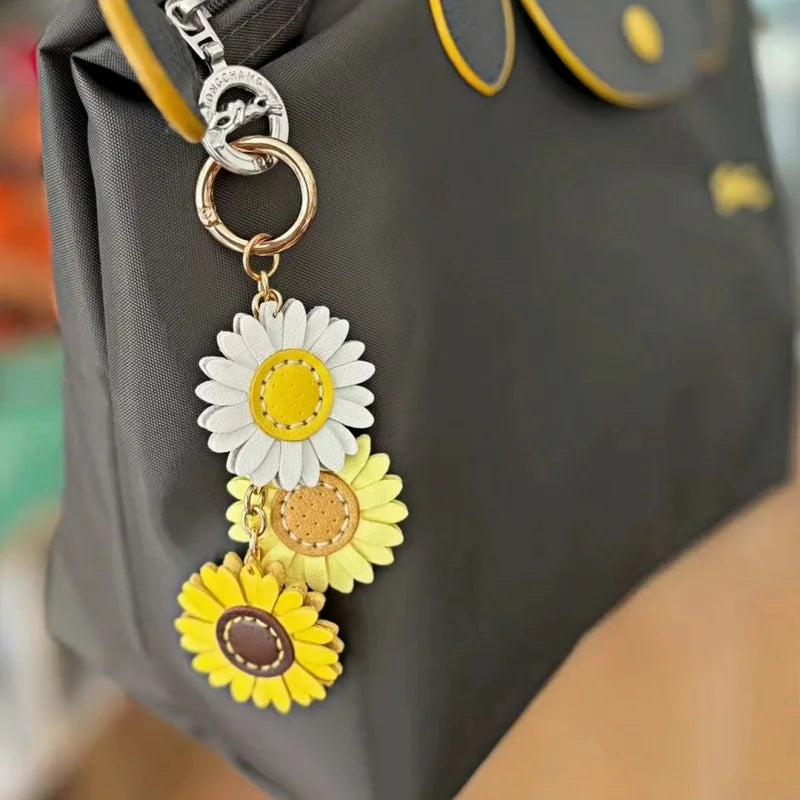 Handmade Leather Daisy Sunflower Bag Charm – Triple Floral Keychain & Handbag Pendant | White, Yellow & Brown Leather Flowers | Elegant Women’s Gift Accessory