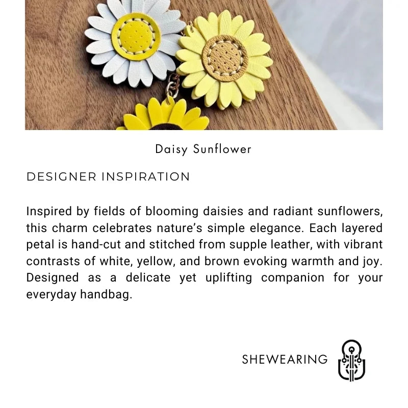 The Handmade Leather Daisy Sunflower Bag Charm captures the cheerful spirit of blooming fields in a refined accessory for everyday style. Featuring three handcrafted flowers in white, yellow, and golden brown, each petal is precisely cut from premium leather and secured with detailed stitching that enhances both durability and beauty. The charm is anchored by a polished gold-tone ring and chain, allowing it to be used seamlessly as a handbag pendant or as a keychain. Its vibrant yet natural palette makes it versatile enough to complement canvas totes, luxury handbags, or minimalist satchels, adding a refreshing pop of color and artisanal detail. Lightweight yet durable, this charm embodies both elegance and playfulness. Whether given as a thoughtful gift or chosen as a personal keepsake, it offers a delicate floral accent that brightens every occasion while showcasing craftsmanship that is built to last.