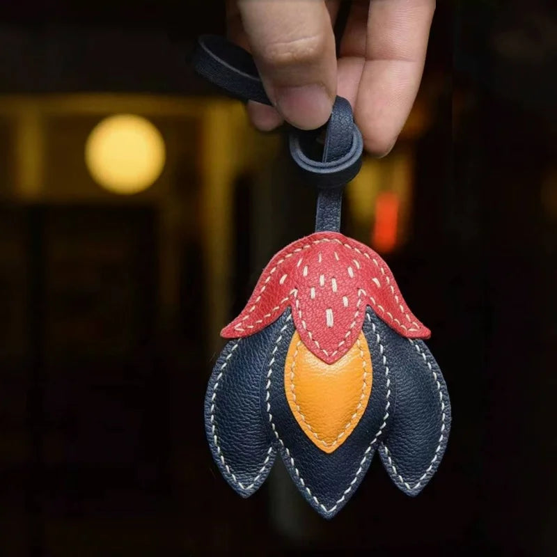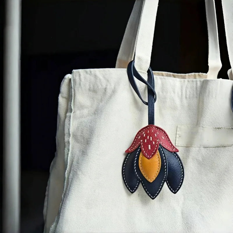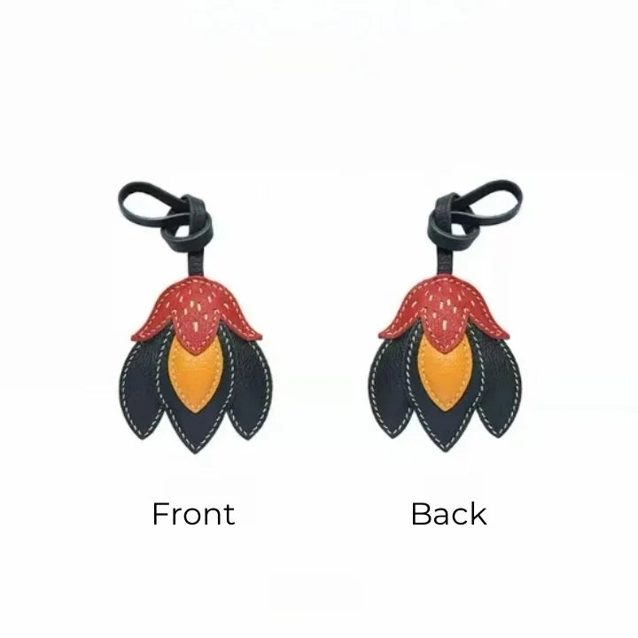 Handmade Leather Tulip Bag Charm – Original Red-Orange & Yellow Petal Design | Full-Grain Leather Pendant & Keychain | Minimalist Artistic Handbag Accessory