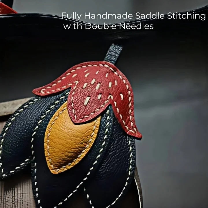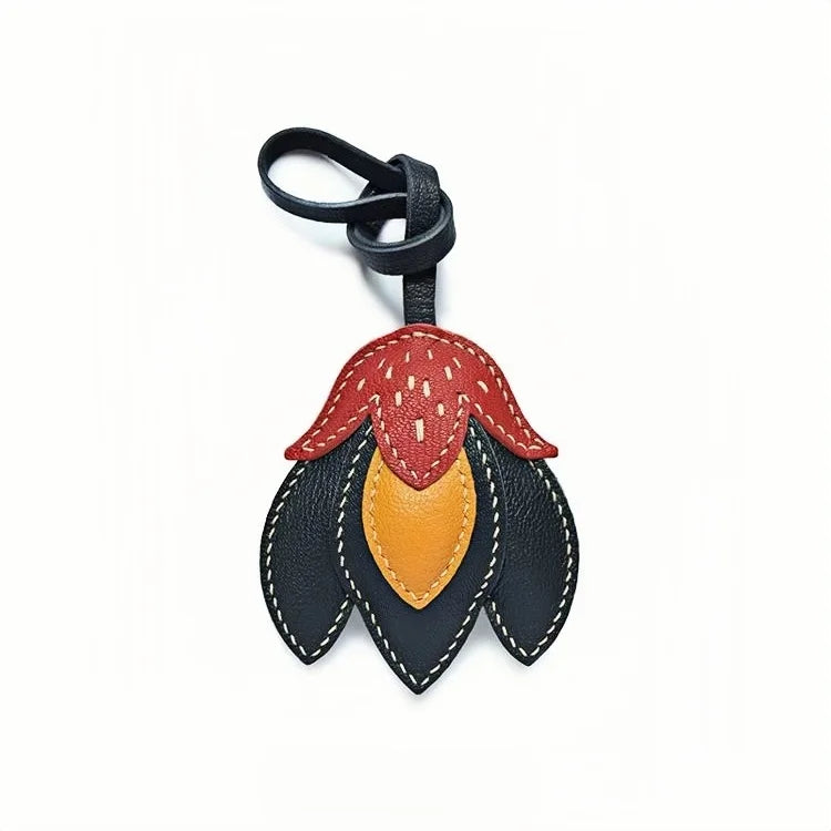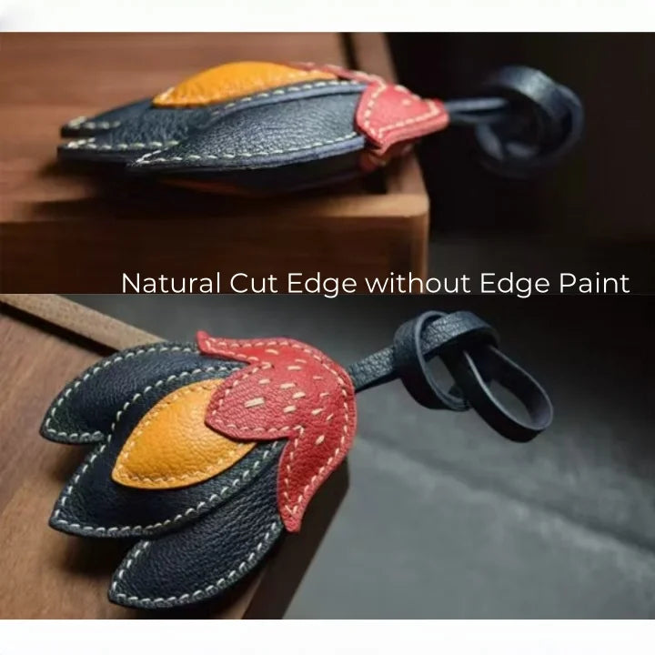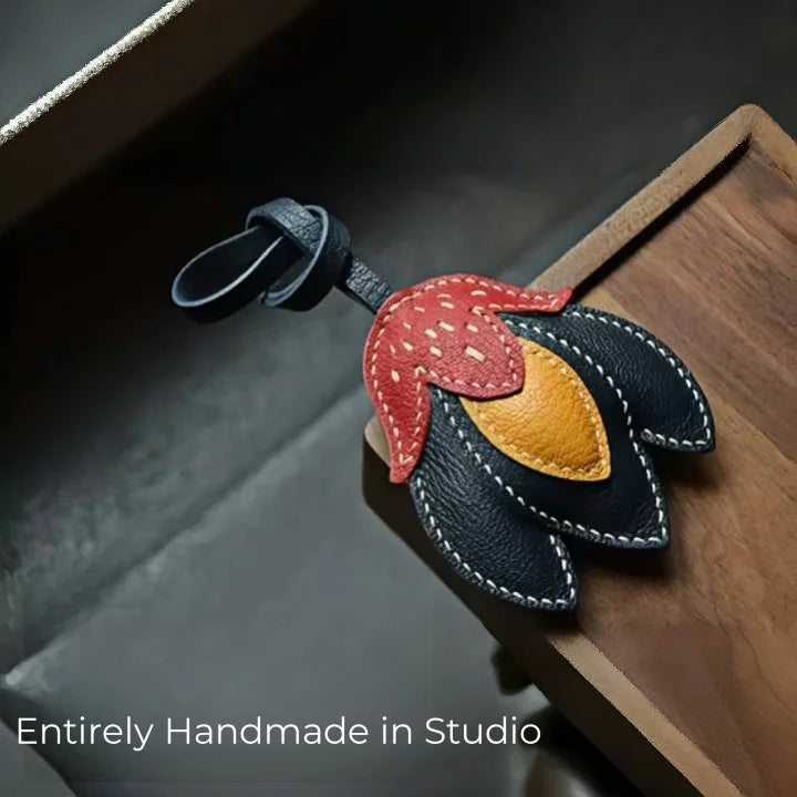 The Handmade Leather Tulip Bag Charm is a striking accessory designed to blend simplicity with individuality. Crafted from premium full-grain leather, it features layered petals in contrasting tones: a vivid red-orange upper petal, golden yellow inner accent, and deep black leather base. Each element is meticulously cut and saddle-stitched by hand with durable double-needle technique, ensuring strength and artisanal precision. Measuring approximately 8.5 cm by 7.5 cm with a 16 cm strap, it hangs elegantly from tote handles, satchels, or minimalist handbags without overwhelming the silhouette. The natural leather cut edges and visible stitching highlight its raw authenticity, while the padded texture adds dimension and durability. This versatile charm also doubles as a keychain, making it a functional yet stylish piece. Perfect for gifting or adding a touch of artistic flair to your personal collection, the tulip charm captures a timeless balance between creativity, craftsmanship, and modern sophistication.