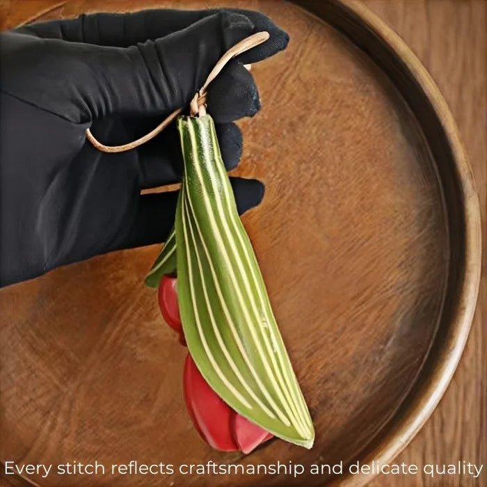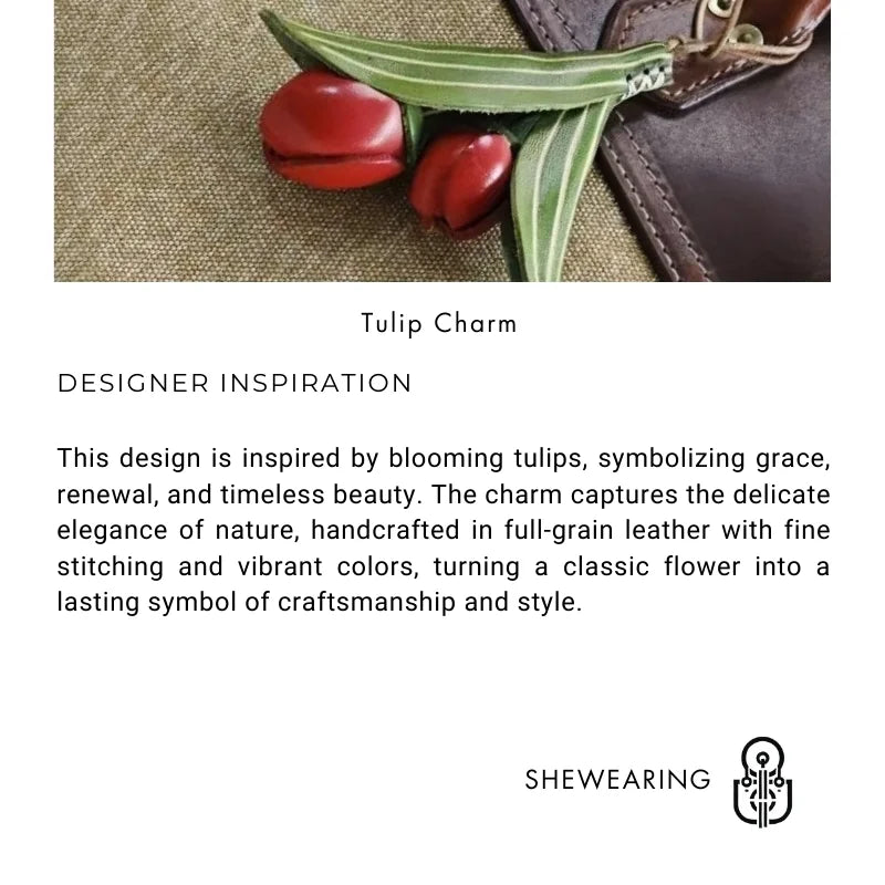 The Handmade Tulip Leather Bag Charm is a statement piece that blends artistry and functionality. Crafted from premium full-grain cowhide, it features vibrant red tulip blossoms and delicately carved green leaves, each detail carefully shaped by skilled artisans. Its unique floral form adds a touch of natural elegance, while the sturdy construction ensures long-lasting quality. Designed with a secure leather strap, this charm can be easily attached to handbags, totes, or key rings, making it both decorative and versatile. More than a simple accessory, it reflects the philosophy of slow fashion, where handmade craft and thoughtful design are celebrated. The tulip symbolizes love, renewal, and grace, making this charm not only a stylish decoration but also a meaningful gift. Perfect for women who appreciate unique design, artisan quality, and a touch of nature-inspired sophistication in their everyday accessories.