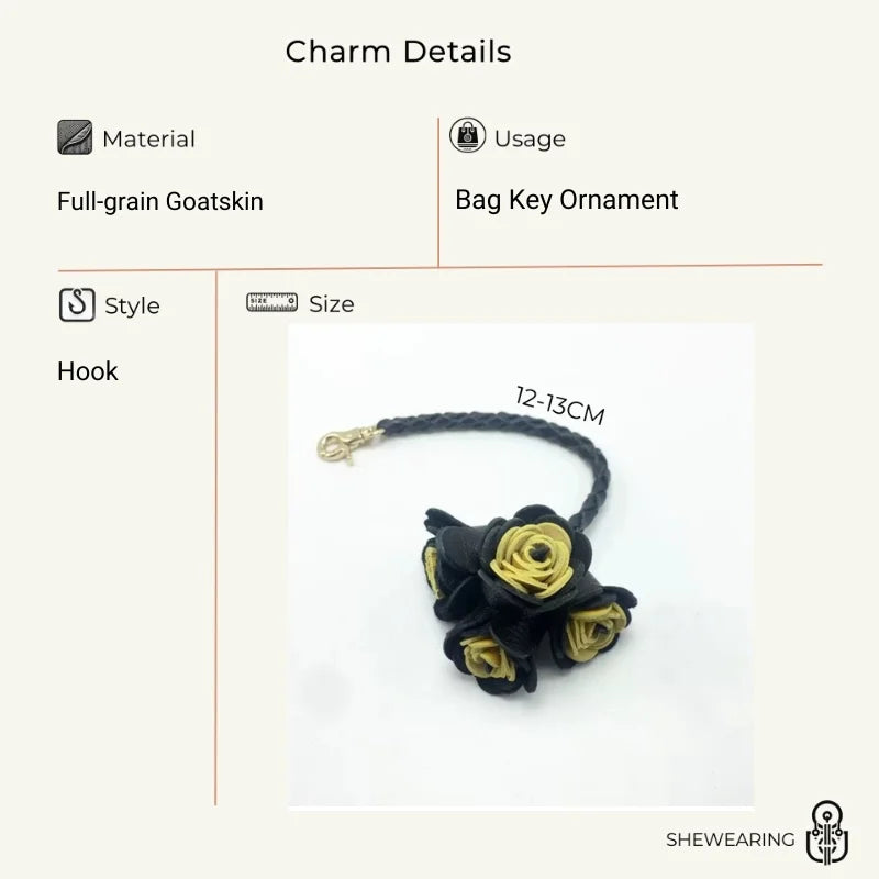 This DIY handwoven genuine leather tassel floral bag charm blends romantic design with refined craftsmanship. Each flower is carefully crafted from high-quality leather, giving it a soft yet durable texture. The petals are layered to create a lifelike bloom, while the hand-braided strap offers both strength and an artisanal touch. The gold-tone clasp allows for easy attachment to handbags, backpacks, or keyrings, making it a versatile and stylish companion.