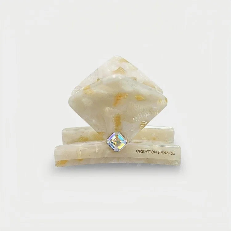 Ivory Marble Acetate Hair Claw Clip – Elegant Geometric French-Inspired Hair Accessory | Handmade Textured Square Design with Crystal Accent | Chic Minimal Hair Clip Gift for Her