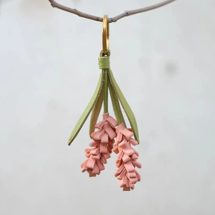 The leafy tops, dyed in natural olive or pistachio tones, balance the soft pink, purple, or white flower clusters—offering a rustic palette that complements both casual and refined accessories. Measuring 10.5cm in length, the piece is lightweight yet dimensional, ideal for use as a keychain, journal charm, or handbag pendant.