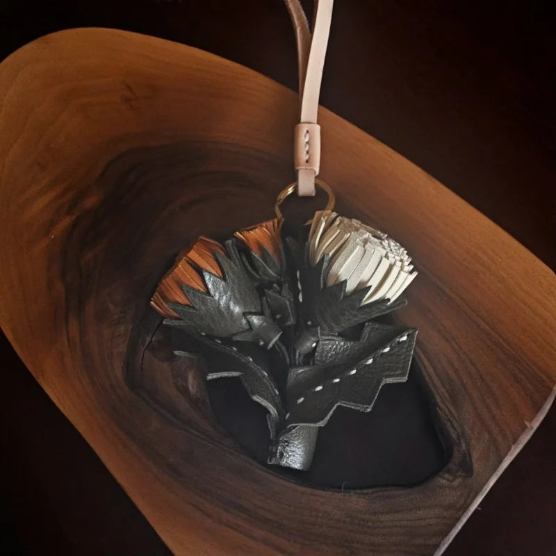 The natural texture of vegetable-tanned leather develops character with time, making each charm a personal piece that evolves with its owner. Its versatile strap allows easy attachment to handbags, totes, or keys, while the bouquet-style composition adds depth and a refined artistic touch.