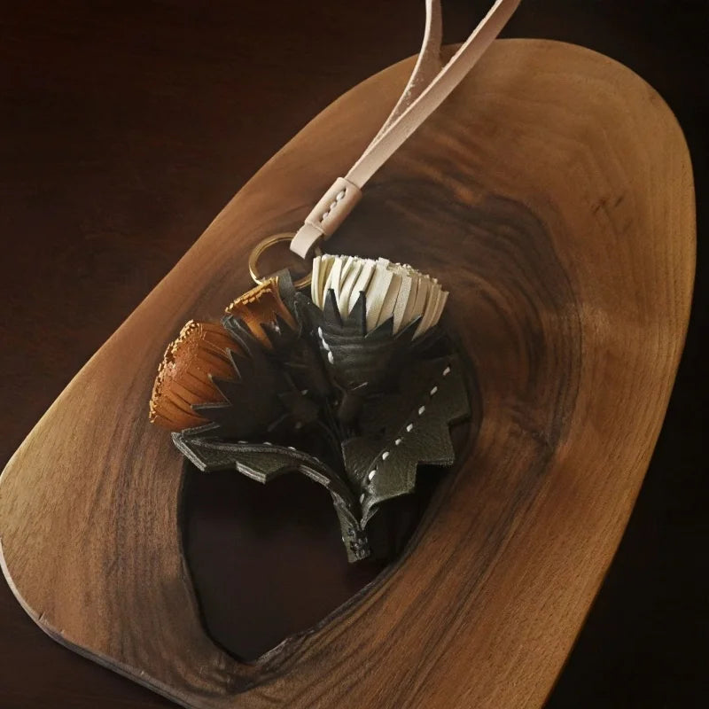 Leather Dandelion Flower Bag Charm – Handmade Vegetable-Tanned Cowhide Pendant | Minimalist Floral Keychain | Elegant Handbag Accessory