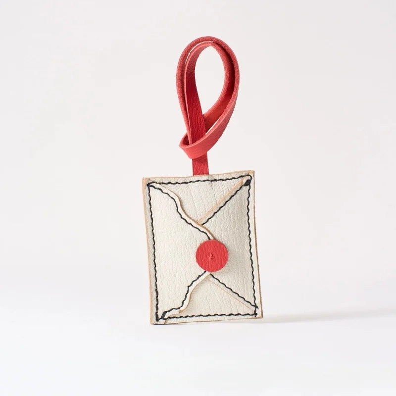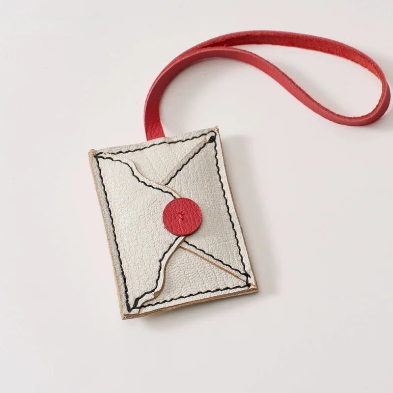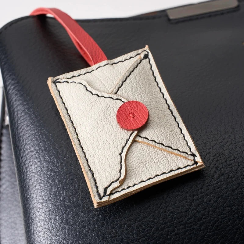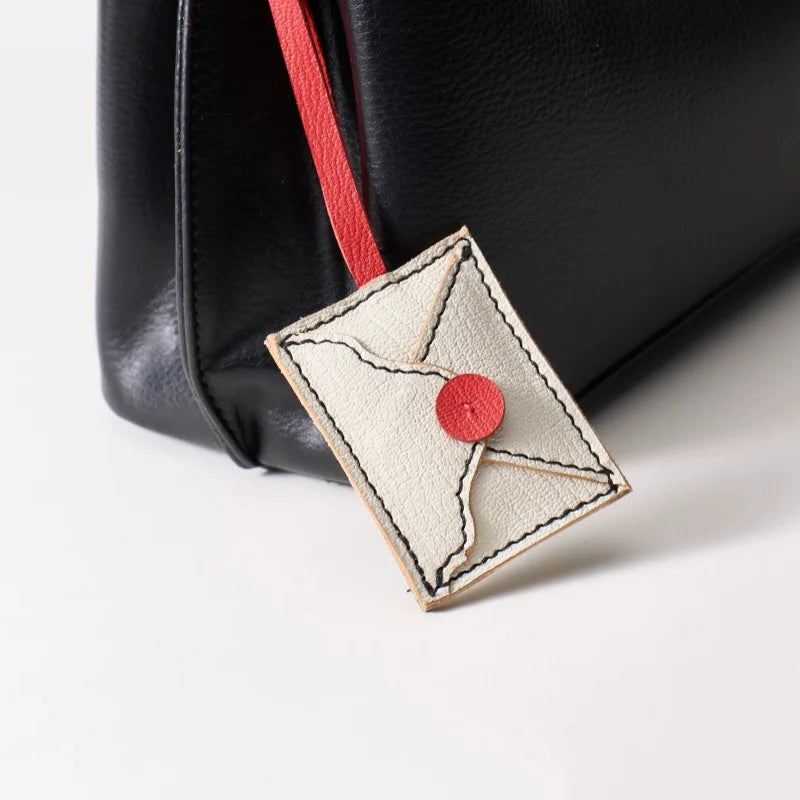 This charming Love Letter bag charm reimagines the elegance of vintage stationery into a wearable leather accessory. Made from supple French goatskin, the envelope silhouette features a bold red seal and delicately stitched border, emulating the beauty of a handwritten note. Every detail, from the curved flap to the wax-seal button, is handcrafted to bring a sense of intimacy and nostalgia. The design is lightweight yet durable, ideal for decorating handbags, totes, or backpacks with a touch of romance. The red leather strap adds a subtle pop of color, enhancing the minimalist yet eye-catching appeal. A perfect gift for women who appreciate sentimental design, fine leather, and everyday elegance.