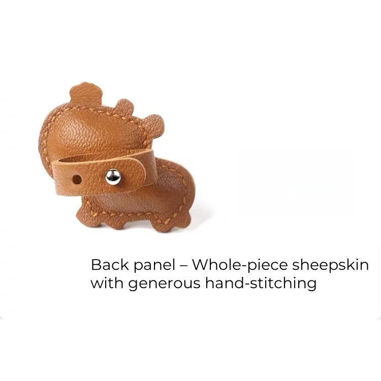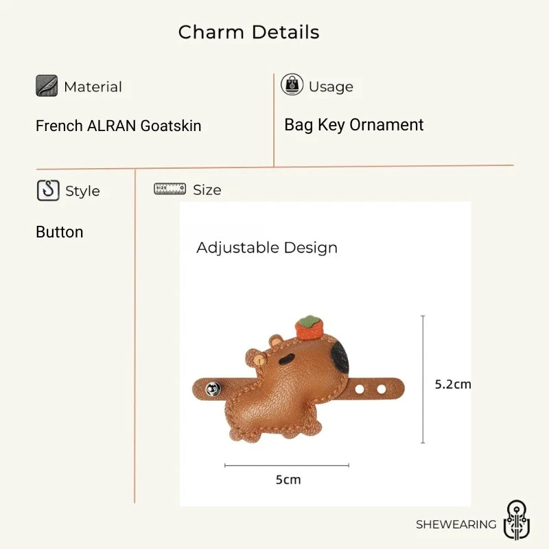 Say hello to serenity and sweetness with the Lucky Capybara Leather Bag Charm, a joyful blend of symbolism and softness. Meticulously crafted from full-grain sheepskin, this charming pendant features a sleepy capybara with a bright orange persimmon perched on its head—an Eastern symbol of good luck and harmony. Designed with an adjustable leather strap and secure button closure, it fits effortlessly on various bag handles, straps, or loops. Measuring approximately 5cm wide by 5.2cm high, it’s compact yet full of personality. The stitching is precise, the leather is rich in grain and texture, and the message is universal: slow down, smile more, and carry a little luck wherever you go. Ideal for gifting or for elevating your own everyday accessory collection.