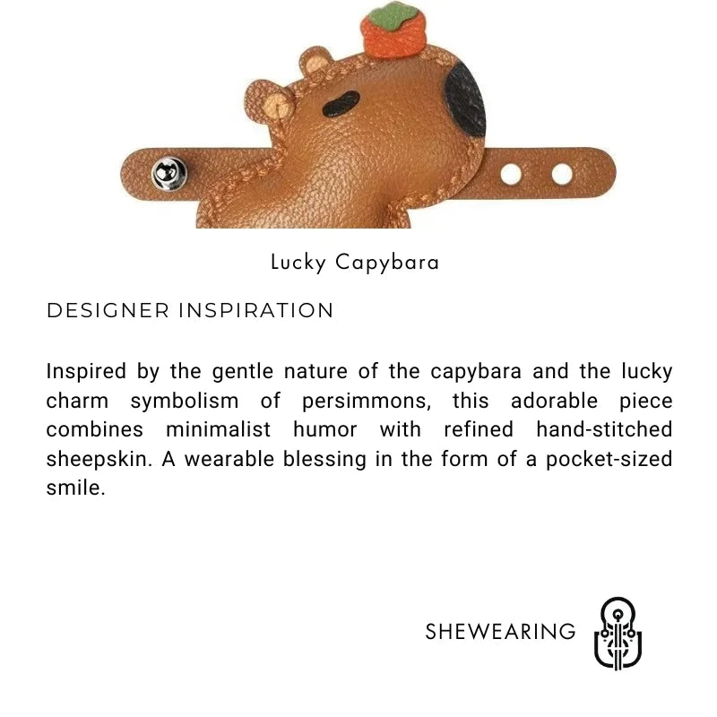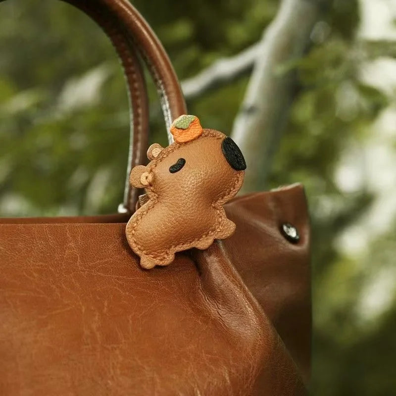 Lucky Capybara Leather Bag Charm – Handmade Sheepskin Capybara with Persimmon Hat | Adjustable Clip-On Pendant | Whimsical Good Luck Gift