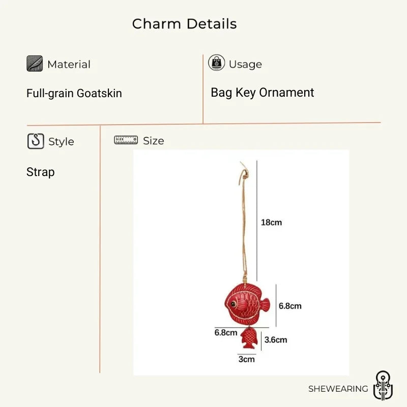 The Lucky Fish Leather Bag Charm is a delightful accessory handcrafted from premium full-grain cowhide leather. The bright red fish represents joyful energy and hopeful abundance, while the small fish detail adds movement and playful character.
