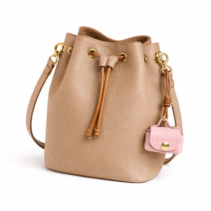 Designed to hold small essentials such as earphones, rings, coins, or tiny personal items, it offers discreet functionality while maintaining a refined appearance. The compact silhouette keeps it lightweight and unobtrusive, making it easy to attach to handbags, totes, or bucket bags using the durable leather strap. Subtle hardware details add a gentle touch of polish without overpowering the natural beauty of the leather.