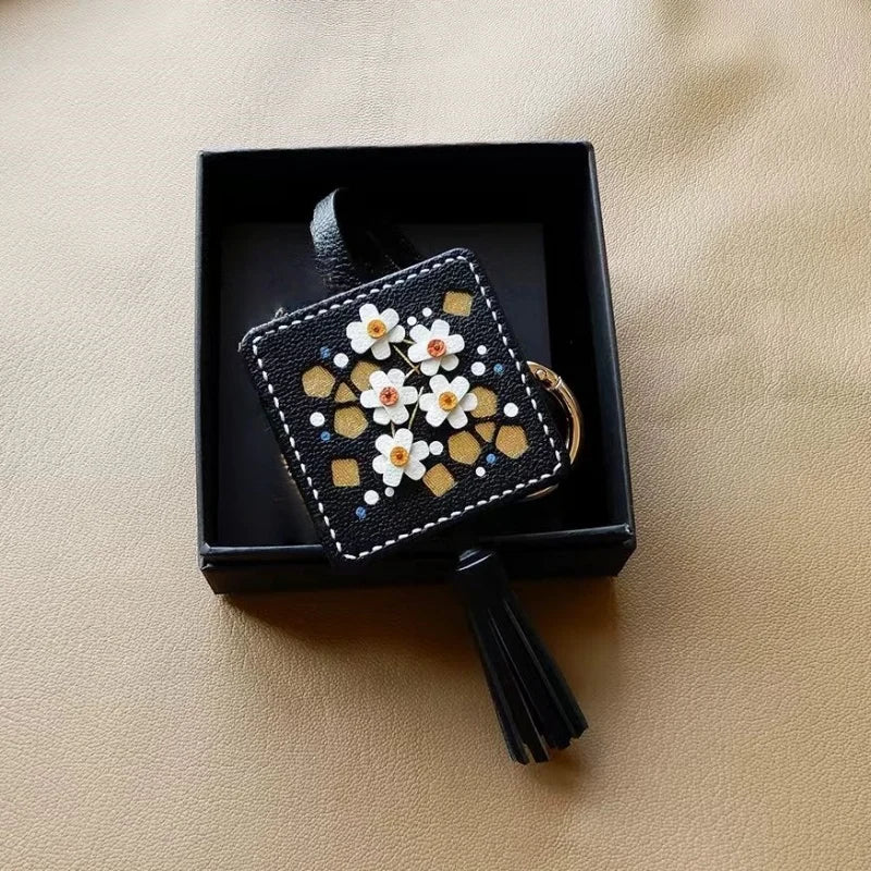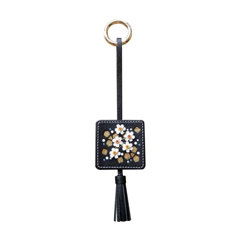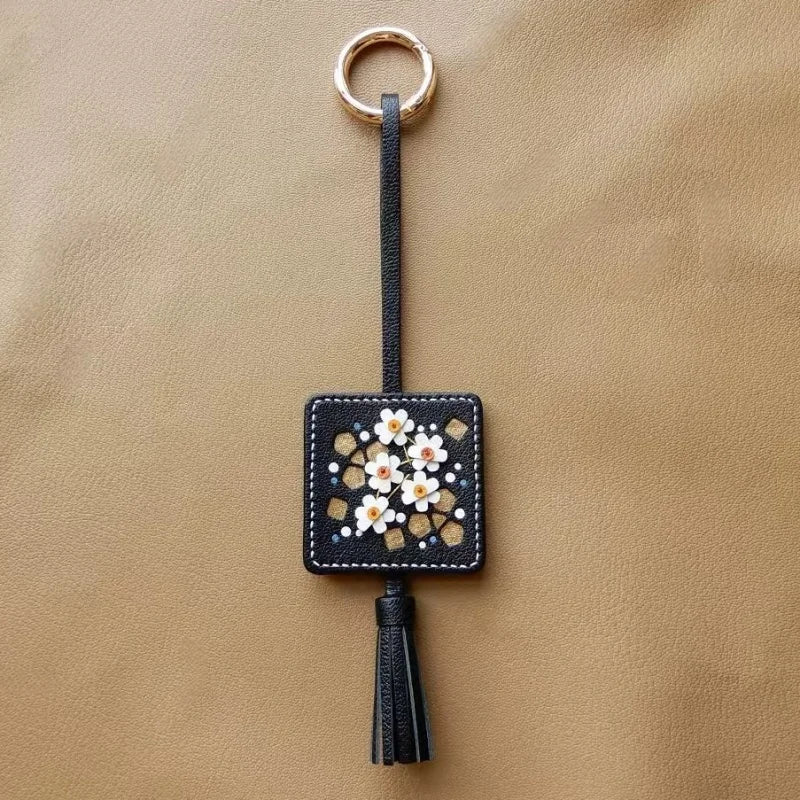 The central design showcases a meticulously hand-stitched floral arrangement, set within a sophisticated square frame with complementary golden accents. A delicate, matching leather tassel adds movement and sophistication. The reverse side is finished with the same impeccable quality. This charm is a subtle yet powerful statement piece, reflecting the wearer’s appreciation for original design, exclusive materials, and enduring, detailed craftsmanship. It's presented in premium packaging, making it an ideal, memorable birthday or holiday gift.
