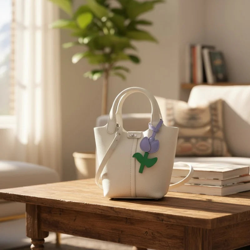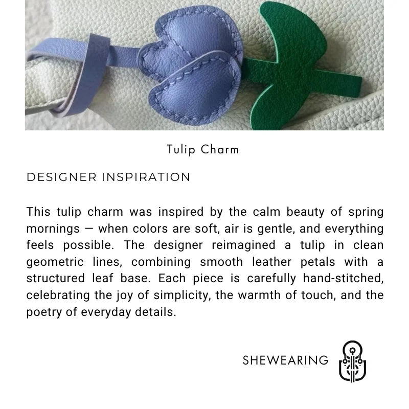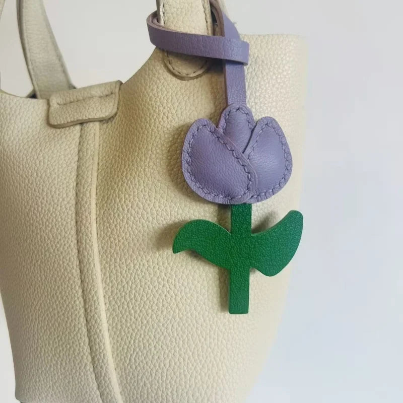 The Pastel Tulip Leather Bag Charm captures the essence of spring through color and craftsmanship. Each charm is handmade from full-grain leather with gentle hues of lilac, pink, or yellow — each petal hand-stitched to form a three-dimensional bloom.