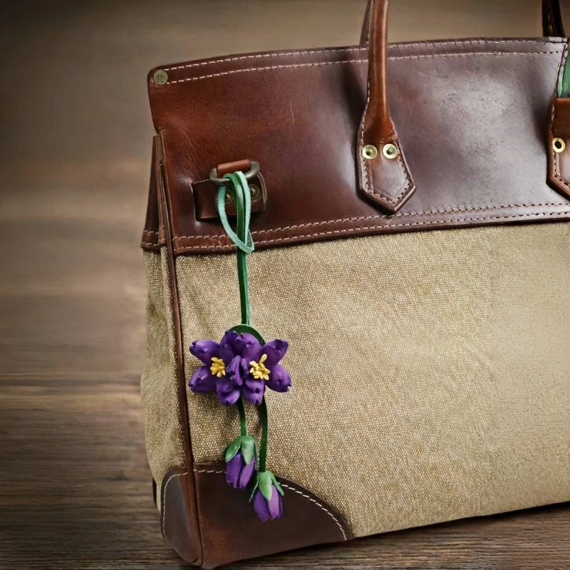 This Purple Blossom Leather Bag Charm is a handcrafted piece that embodies the perfect balance between artistry and functionality. Made from premium full-grain leather, each petal and leaf is carefully cut, shaped, and stitched by hand, bringing the charm of blooming flowers into your accessories. The vibrant purple petals are contrasted with fresh green stems and highlighted with yellow stamens, making the flower appear lively and dimensional.