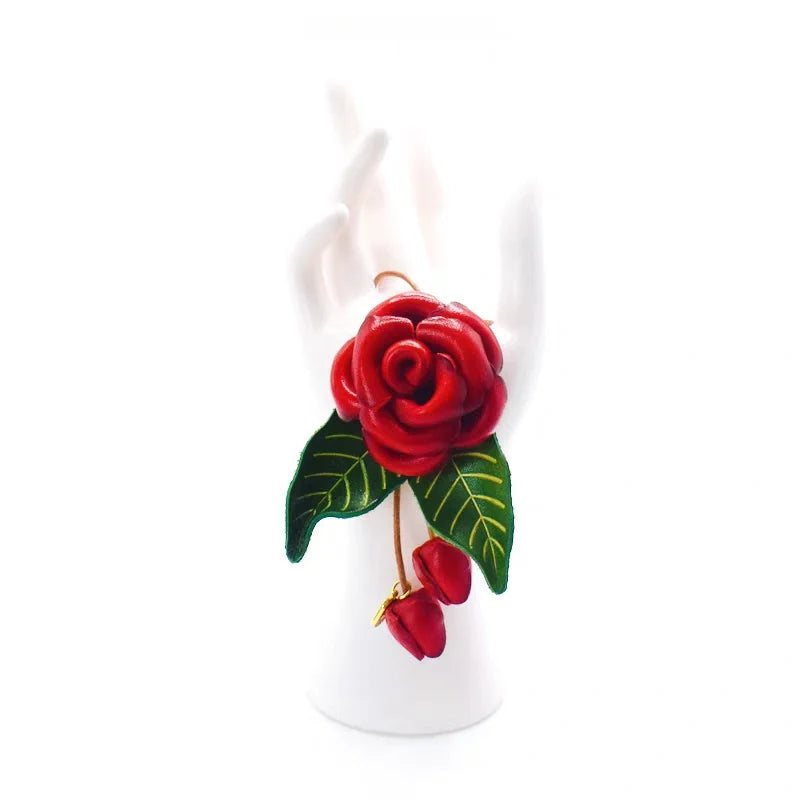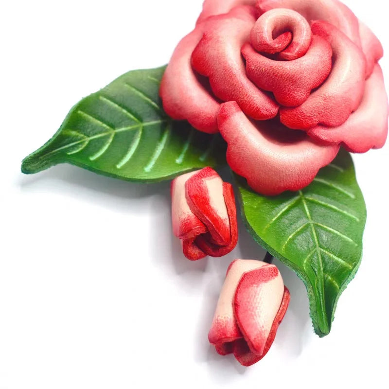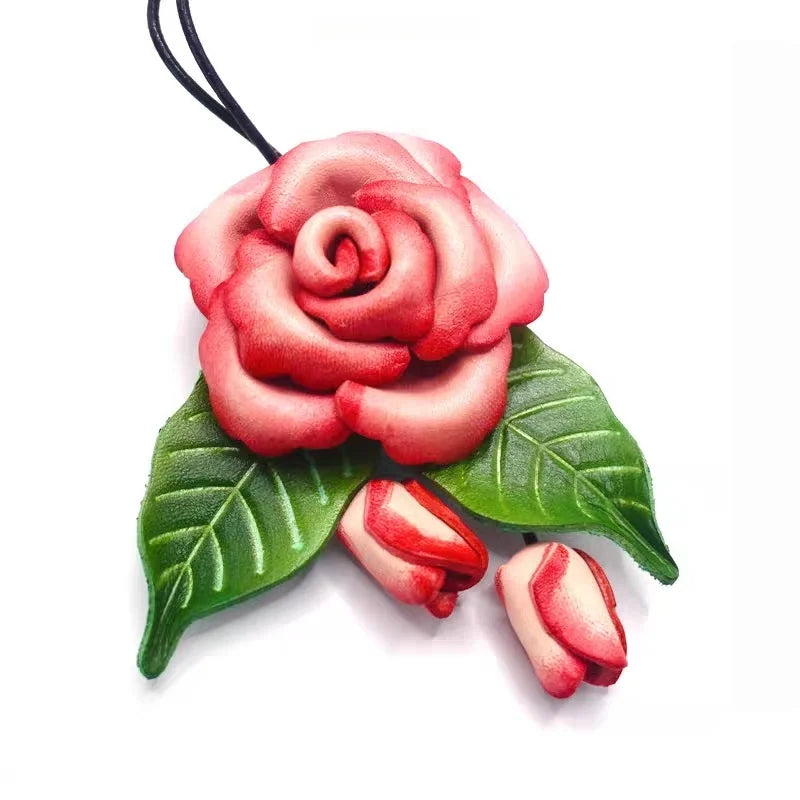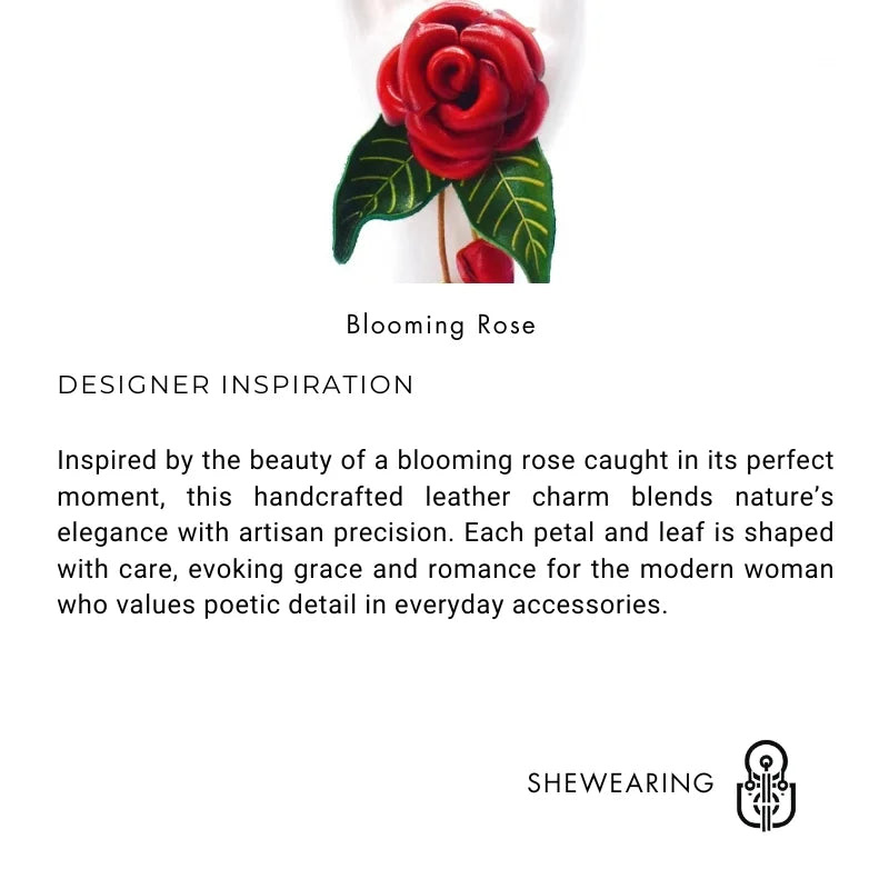 Celebrate the elegance of nature with our Blooming Rose Leather Bag Charm. Handcrafted from full-grain leather, this exquisite accessory features a vividly sculpted rose in full bloom, paired with delicate rosebuds and verdant leaves. Each element is carefully hand-dyed and shaped, offering rich texture, visual depth, and a touch of organic artistry. The 3D design makes it stand out as both a sophisticated decoration and a conversation starter. Whether used on handbags, keychains, or as a unique gift, this piece adds poetic charm to any ensemble. Measuring approximately 11cm in length, it’s the perfect expression of timeless femininity and slow-crafted luxury.