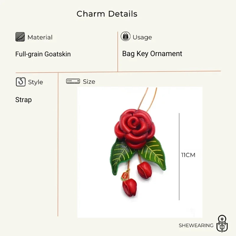Romantic Blooming Rose Leather Bag Charm – Handmade Full-Grain Leather Flower Pendant | Artistic Accessory for Handbags | Timeless Gift for Women