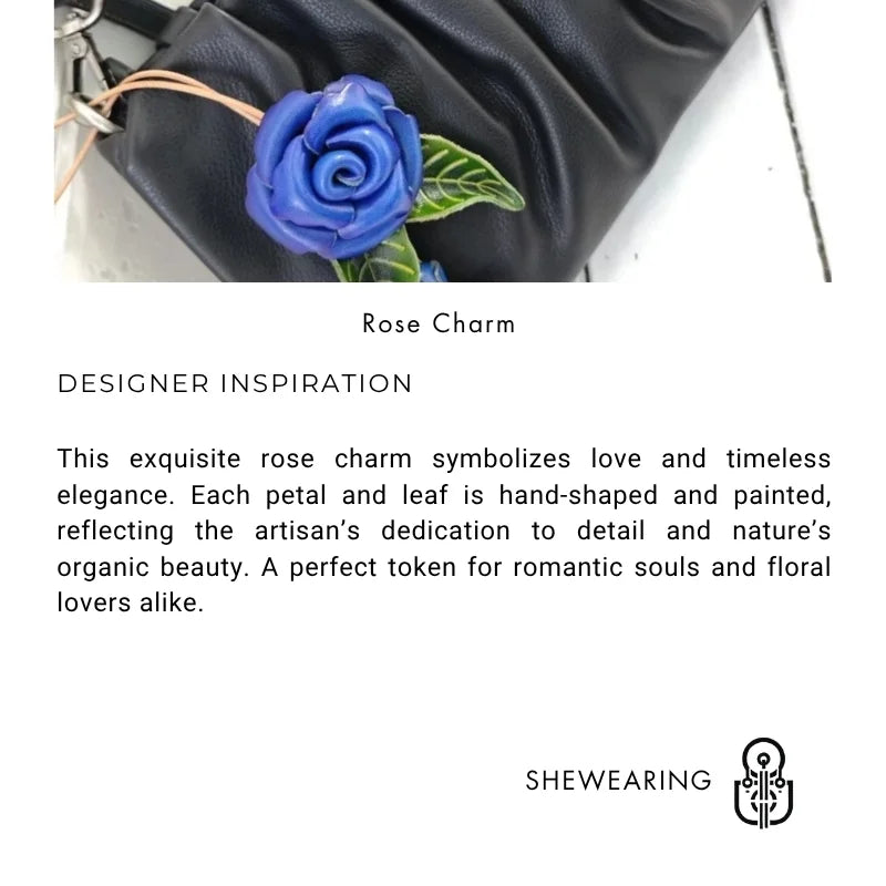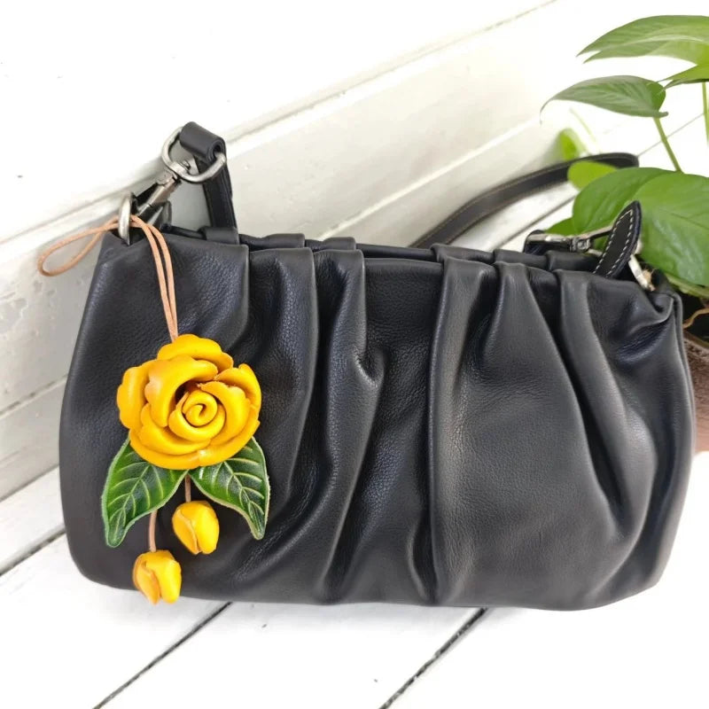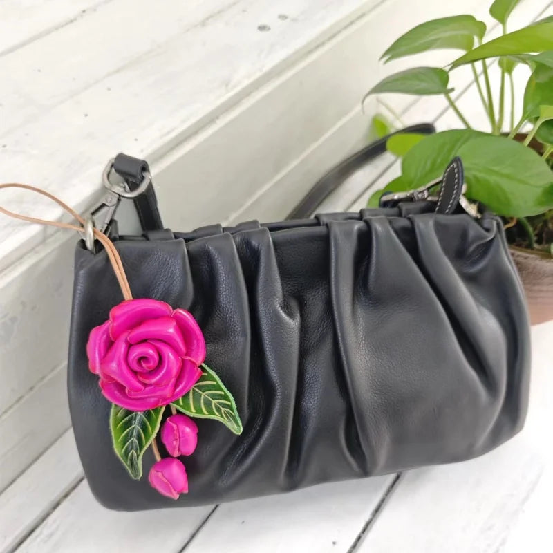 Crafted from premium full-grain leather, this handmade rose bag charm brings elegance and charm to any handbag or backpack. The delicate rose bloom, paired with two rosebuds and detailed green leaves, is sculpted and dyed entirely by hand, creating a natural and realistic floral accessory. The soft yet durable leather ensures a luxurious texture, while the adjustable loop allows for versatile use on various bag styles. Available in multiple colors, this charm is ideal as a gift between close friends or couples, symbolizing affection, beauty, and care. Whether for daily wear or special occasions, this rose charm adds a romantic touch to your style with refined craftsmanship.