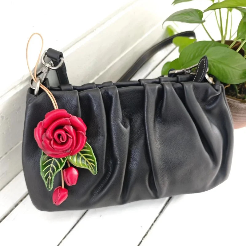 Romantic Rose Leather Bag Charm – Handmade Full-Grain Leather Flower Pendant | Artisan Floral Keychain for Couples & Friends | Elegant Ins-Style Gift Accessory