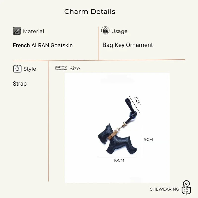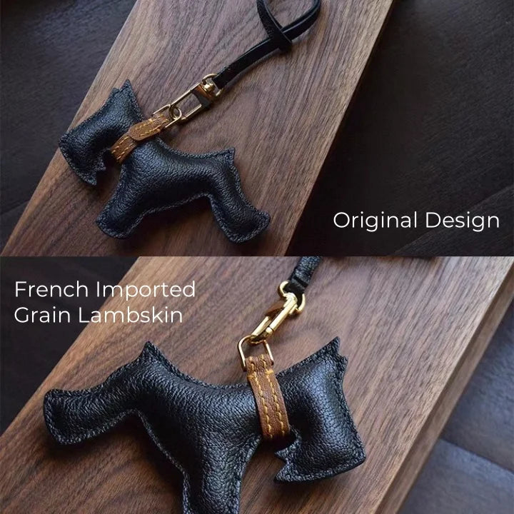 Crafted with precision and passion, this Schnauzer-inspired leather bag charm brings a refined sense of personality to your accessories. Made from premium French imported lambskin, the texture is naturally grainy, soft, and durable. The silhouette echoes the charm of the Schnauzer breed—defined yet minimalist, with hand-stitched accents and a soft three-dimensional form. Finished with a secure gold-tone clasp and leather wrist strap, this charm can be used as a keychain, handbag pendant, or even a thoughtful gift for dog lovers. The neutral black color makes it versatile and understated, pairing effortlessly with modern, classic, or vintage bags. Whether you're accessorizing your daily tote or gifting a stylish friend, this small charm adds a unique story and elevated detail to any ensemble.