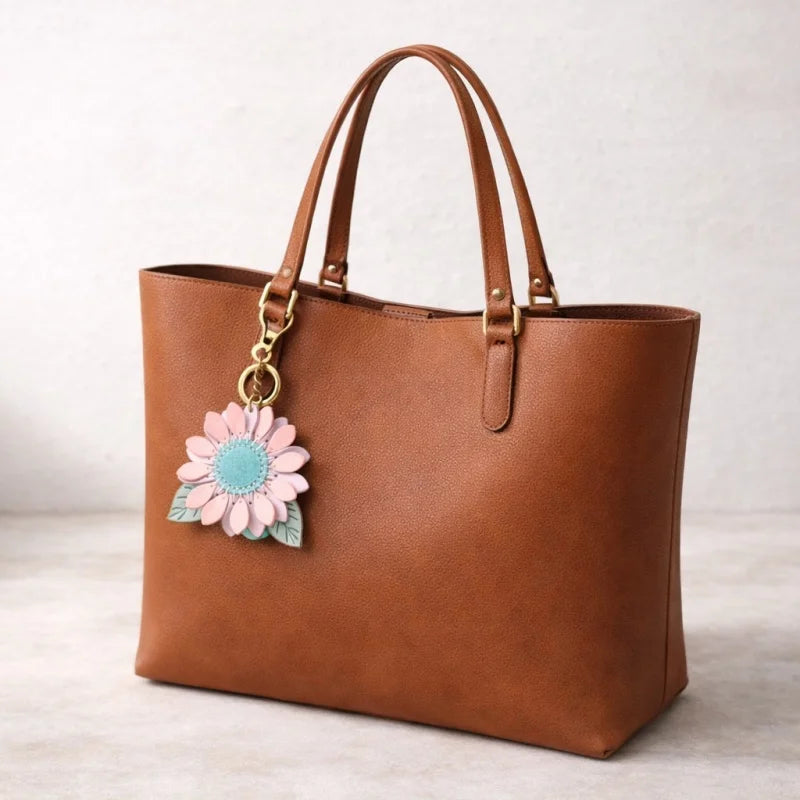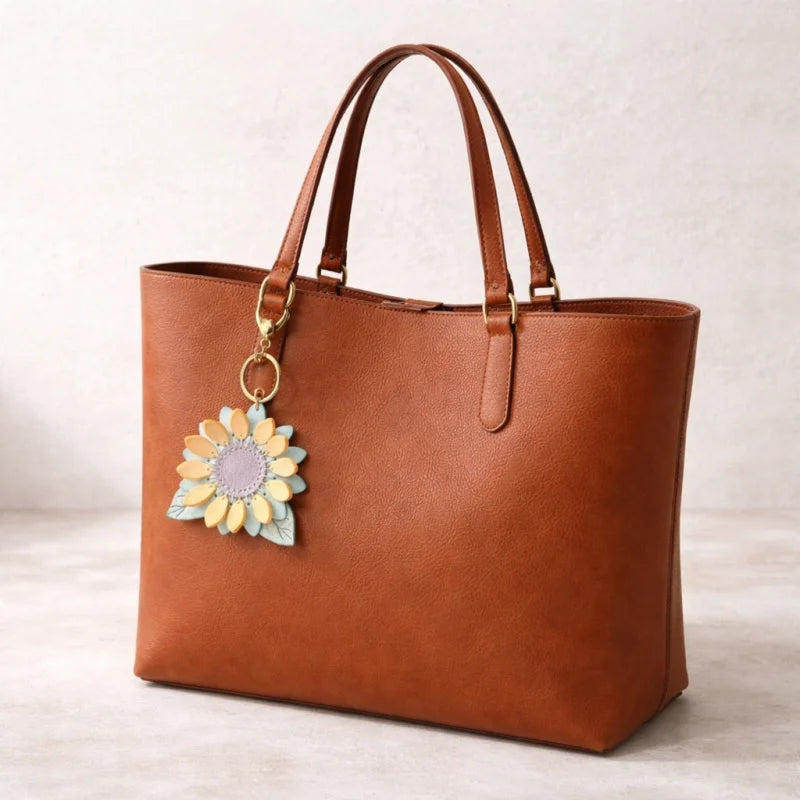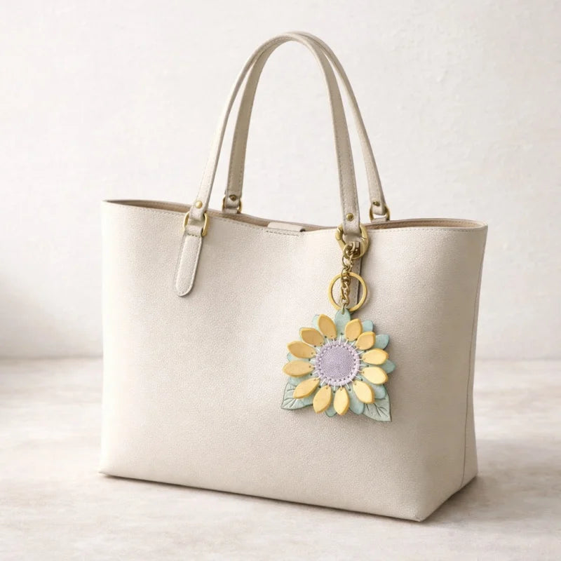 The sunflower has long symbolized optimism, inner strength, and a future full of promise. This piece transforms that meaning into a wearable accent, adding a gentle emotional touch to handbags, totes, or everyday essentials. Its balanced proportions and muted tones allow it to complement both light and dark leather bags without overwhelming the overall look.