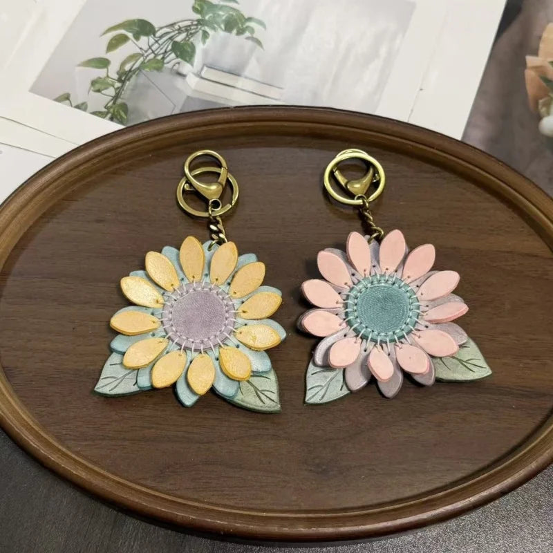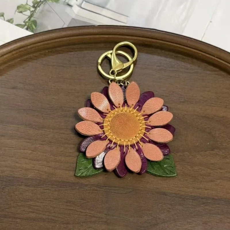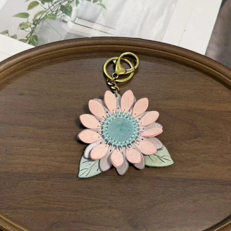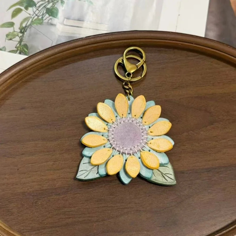 This sunflower leather bag charm is thoughtfully handcrafted from premium full-grain leather with a soft waxed finish, offering both tactile warmth and lasting durability. Designed with layered petals and delicate hand stitching, it captures the natural elegance of a sunflower in a calm, understated form—perfect for women who appreciate refined details rather than bold statements.