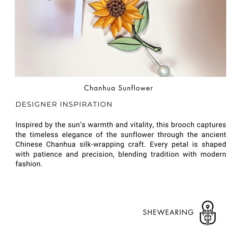 This Traditional Chanhua Sunflower Brooch showcases the beauty of heritage craftsmanship in a modern accessory. Crafted using the ancient Chinese silk-wrapping technique known as Chanhua, each sunflower petal is meticulously hand-shaped from delicate silk threads, resulting in a lifelike floral design that symbolizes warmth, energy, and positivity. The vibrant yellow petals contrast harmoniously with soft green leaves, while a pearl-accented pin adds a refined touch. Lightweight yet durable, it can be worn comfortably on blazers, dresses, scarves, or hats, making it a versatile piece for both formal and casual occasions. This brooch is not only a fashion statement but also a celebration of cultural artistry, making it a meaningful gift for birthdays, anniversaries, or special events. Presented in elegant packaging, it is ready to delight any recipient who appreciates timeless beauty and craftsmanship.