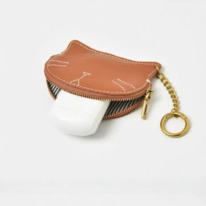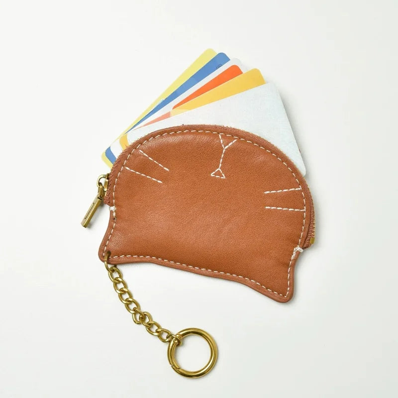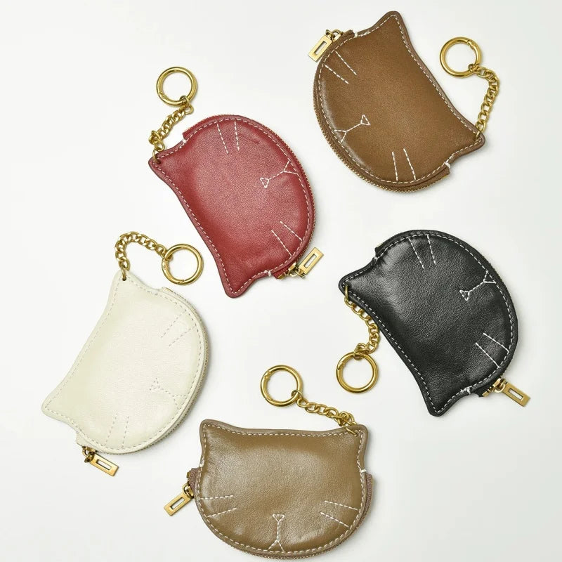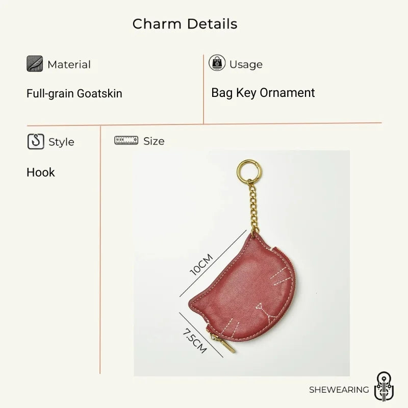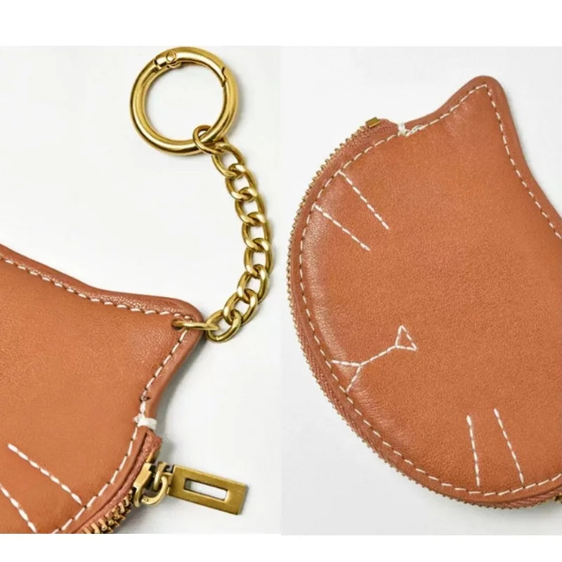 Vintage Cat-Shaped Leather Pouch Charm – Full-Grain Cowhide Zipper Coin Purse for Women | Key, Earphone & Lipstick Organizer | Retro Small Bag Accessory