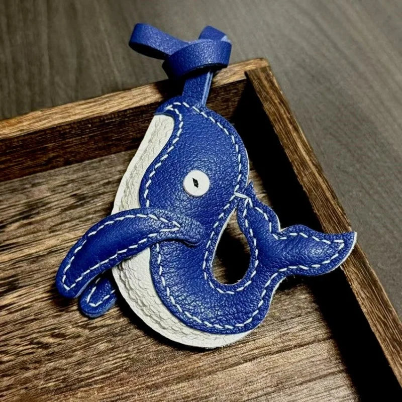 This whale leather bag charm is a designer original, handcrafted from premium genuine leather with careful attention to form, stitching, and texture. The deep blue tone paired with soft ivory details evokes the calm beauty of the ocean, creating a balanced and timeless aesthetic that feels both modern and emotionally grounding.