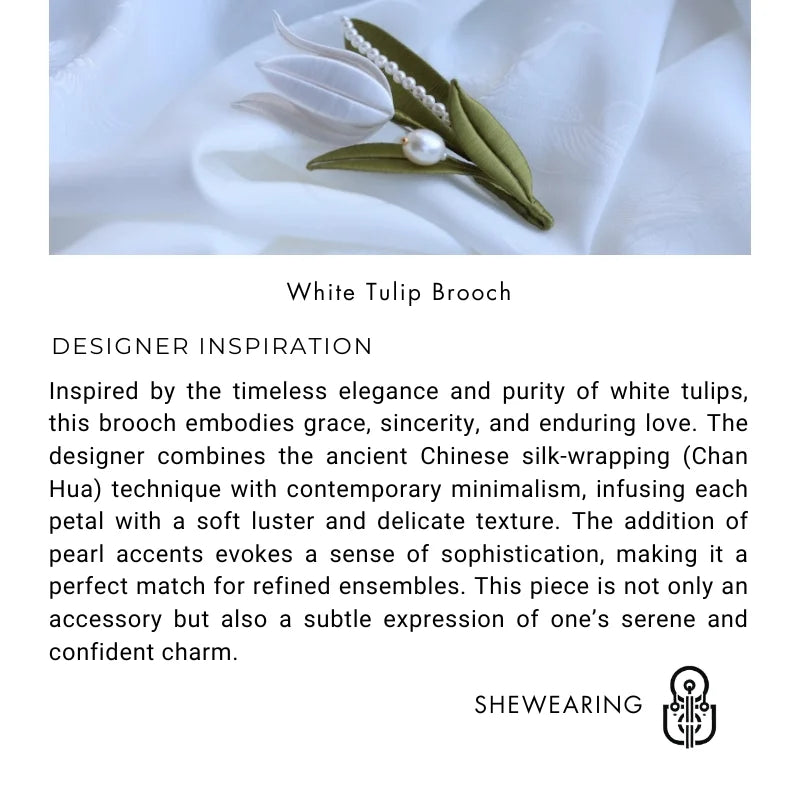 The White Tulip Silk-Wrapped Brooch is a delicate blend of traditional craftsmanship and modern aesthetics. Handmade using the centuries-old Chan Hua technique, each tulip petal is meticulously shaped from lustrous silk threads, giving it a natural, lifelike appearance. The pristine white petals symbolize purity and grace, while the soft green leaves add a refreshing contrast. Embellished with a string of fine pearls and a single statement pearl, this brooch exudes understated luxury.