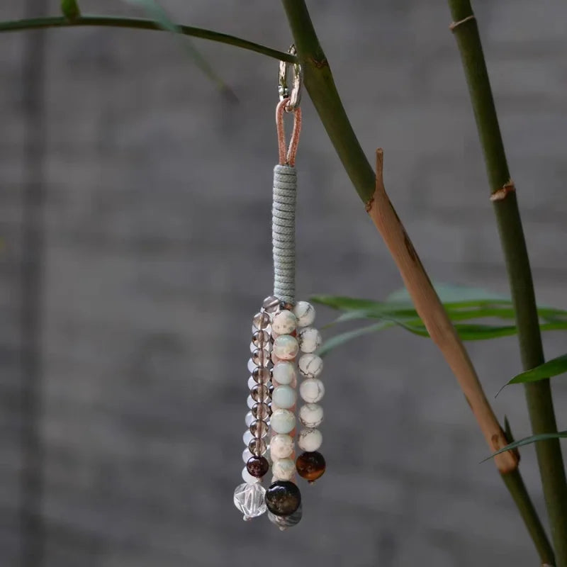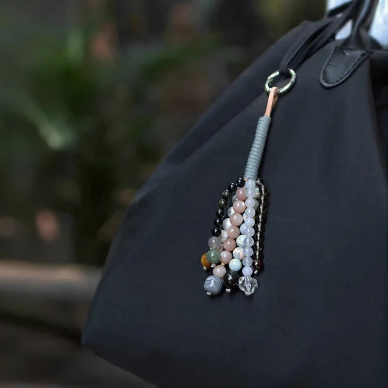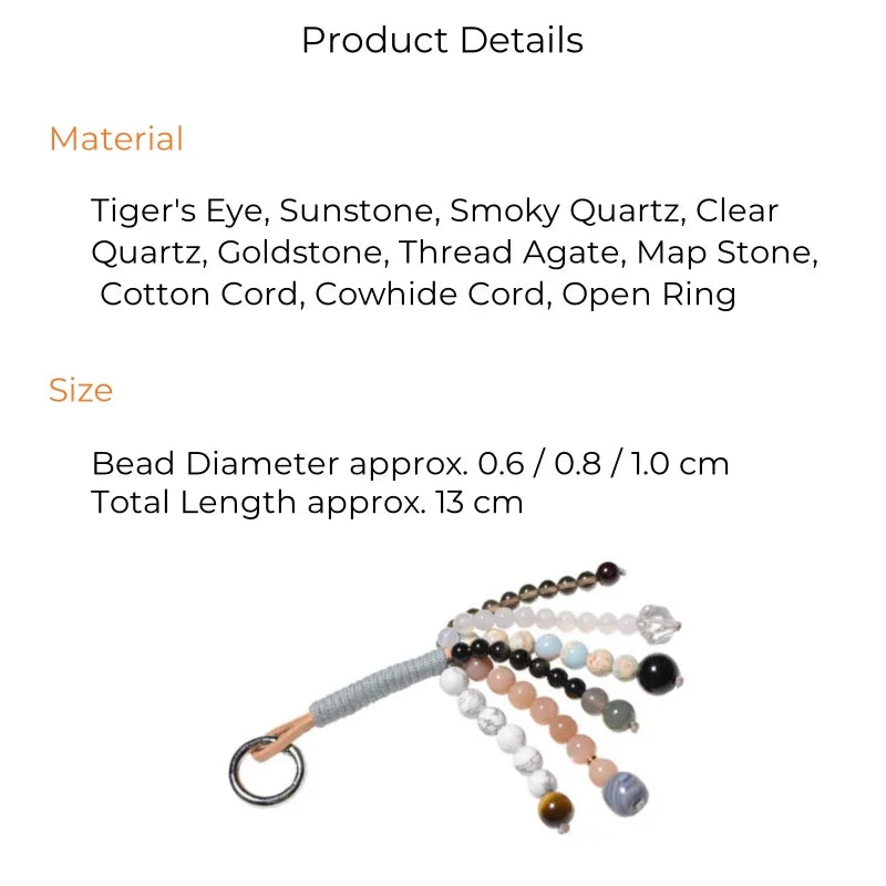 This handcrafted bag charm brings together nine types of natural gemstones, including Tiger’s Eye, Sunstone, Smoky Quartz, Clear Quartz, Goldstone, and more—each bead carefully selected for its natural color and symbolic meaning. Threaded onto strong cotton and cowhide cord, the strands form an elegant beaded tassel that sways softly with every step. Whether used as a keychain, a lucky charm, or a stylish accessory for your handbag, this piece radiates a serene and harmonious energy. With its minimalist knot work and multi-color palette, it adds a subtle statement of mindfulness, nature, and artisanal beauty. Total length is approximately 13cm, making it the perfect lightweight accent for everyday use or thoughtful gifting.